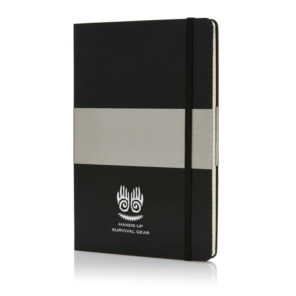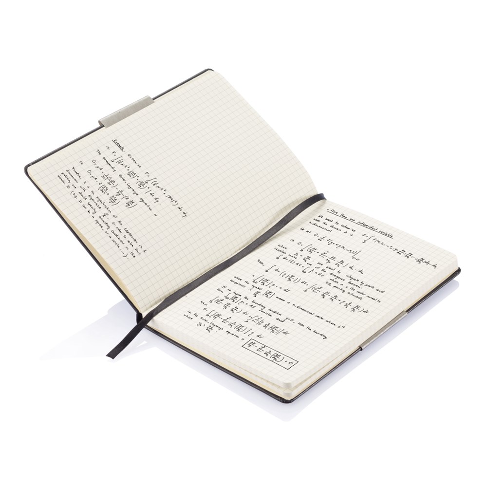 A5 Hardcover Notizbuch mit 80 Seiten von 80g/m Papier, Seitenteiler und Elastikband. Alle Seiten sind kariert (5x5 mm)