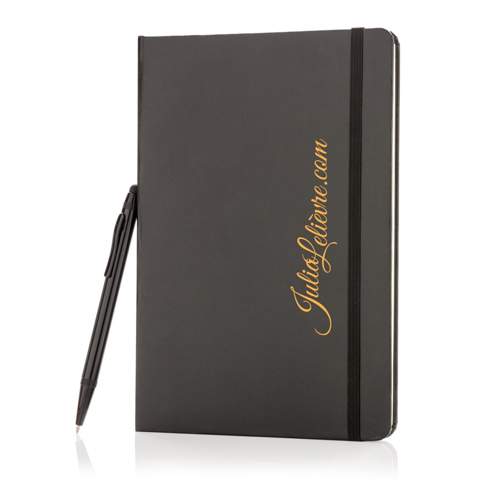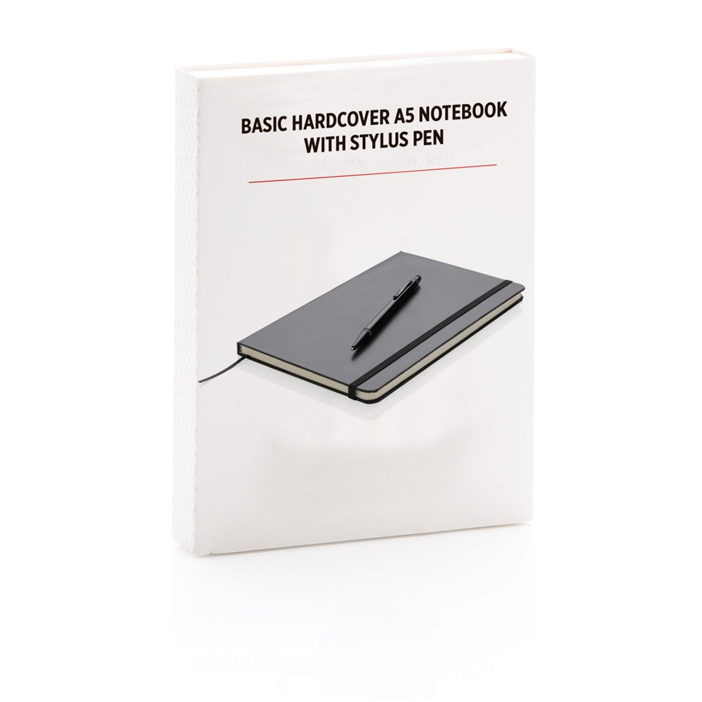 Liniertes Hardcover Notizbuch A5 mit Seitentrenner und elastischem Verschlussband, inkl. Stylus-Stift aus Aluminium. 160 Seiten, 70g/m² - cremefarbene Seiten. In Geschenkverpackung.