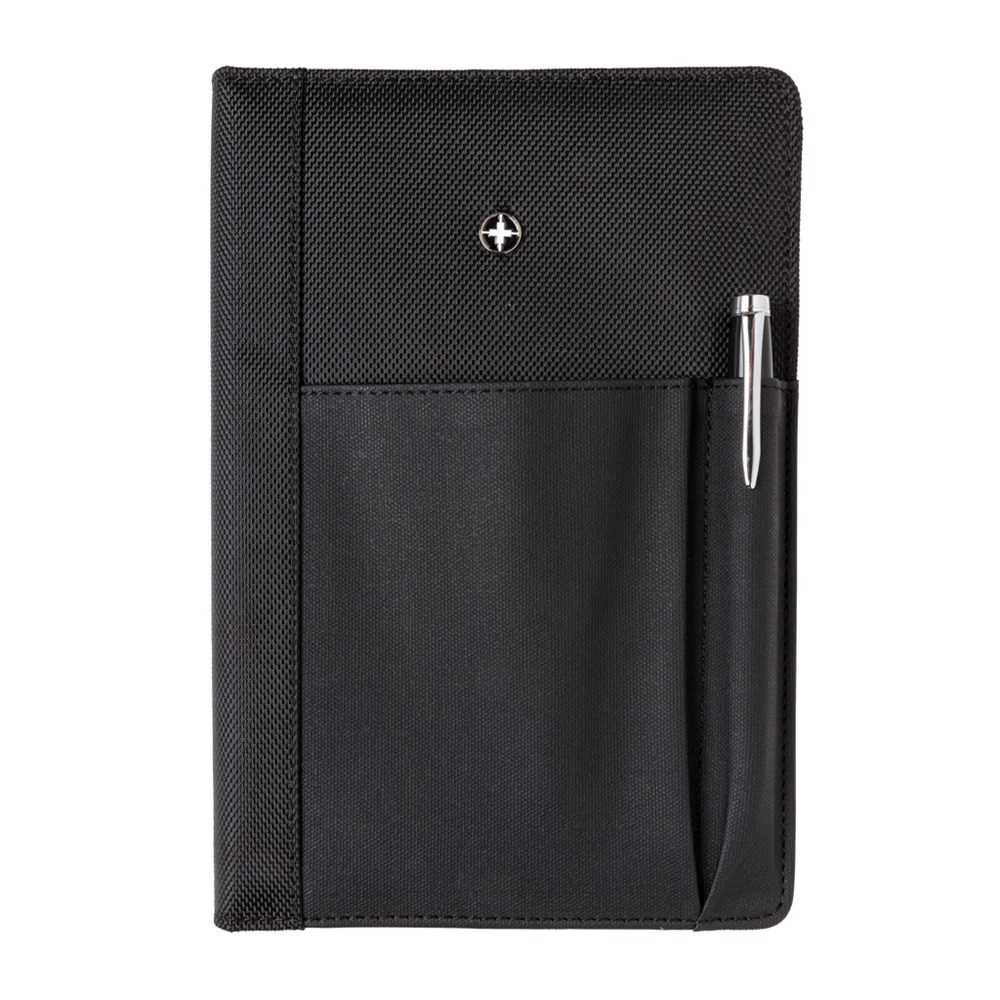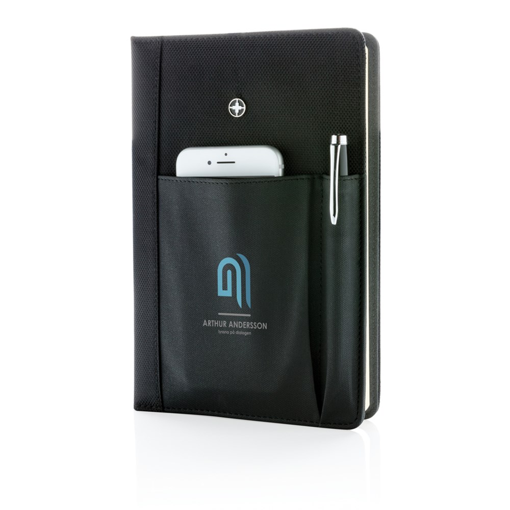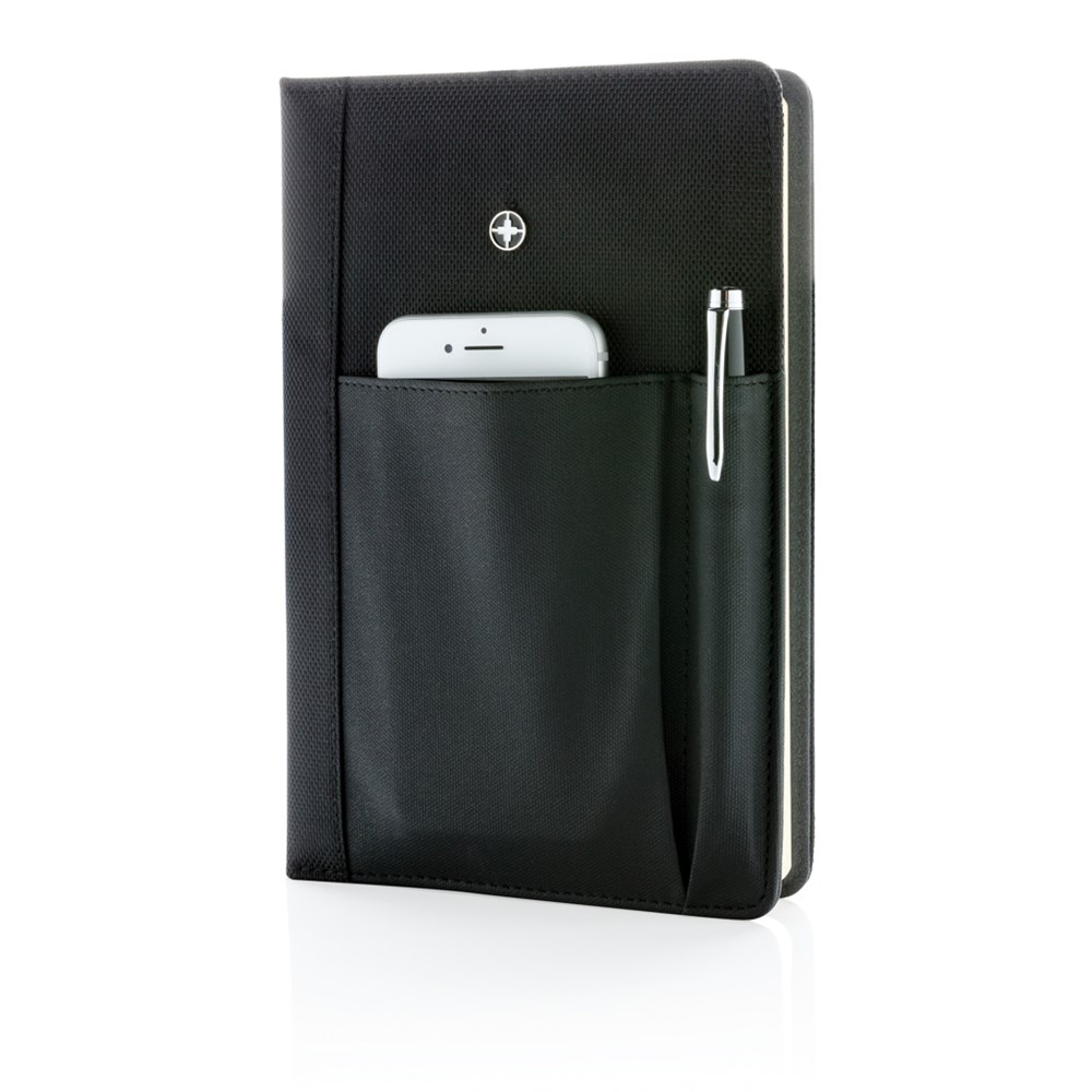 Executive 1680D und 600D Polyester Cover mit herausnehmbaren 192-seitigen Notizbuch und Stift - ca.1200m blauschreibend. Die aufgesetzte Tasche auf der Vorderseite fasst den Stift sowie Ihr Smartphone, Visitenkarten oder Kreditkarten. Verpackt in Swiss Peak Geschenkverpackung.