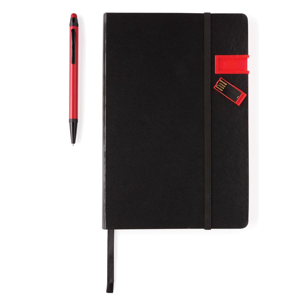 Hardcover Notizbuch mit 8GB USB-Stick. 160 linierte Seiten, 80g/m² - farbiger Beschnitt. Im Set mit einem farblich passenden Aluminium Stylus-Stift. Verpackt in Geschenkbox