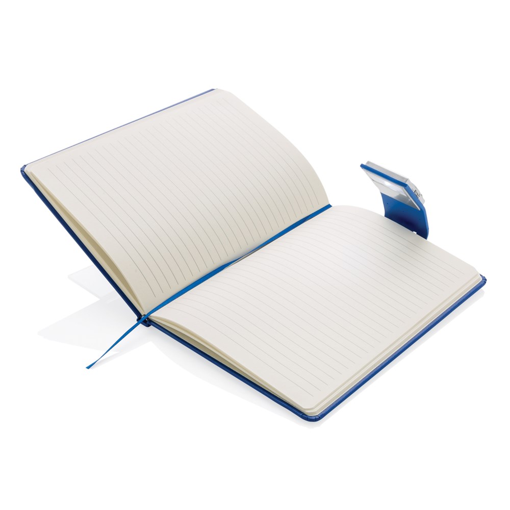 liniertes A5 Notizbuch mit Hardcover und LED Lesezeichen. 160 cremefarbene Seiten, 70gr/m².
