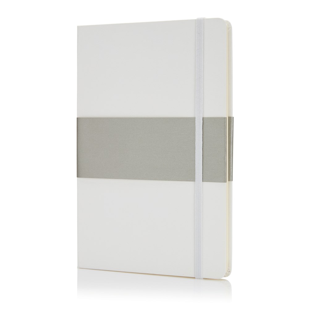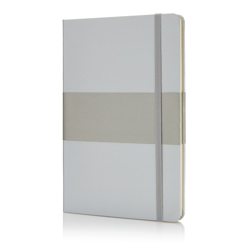 Größe A5, mit silbernem Papiersleeve, schwarzem Seitenteiler und Gummiband, runde Ecken, innen 160 cremefarbene linierte Seiten, 80g/m² Papier.