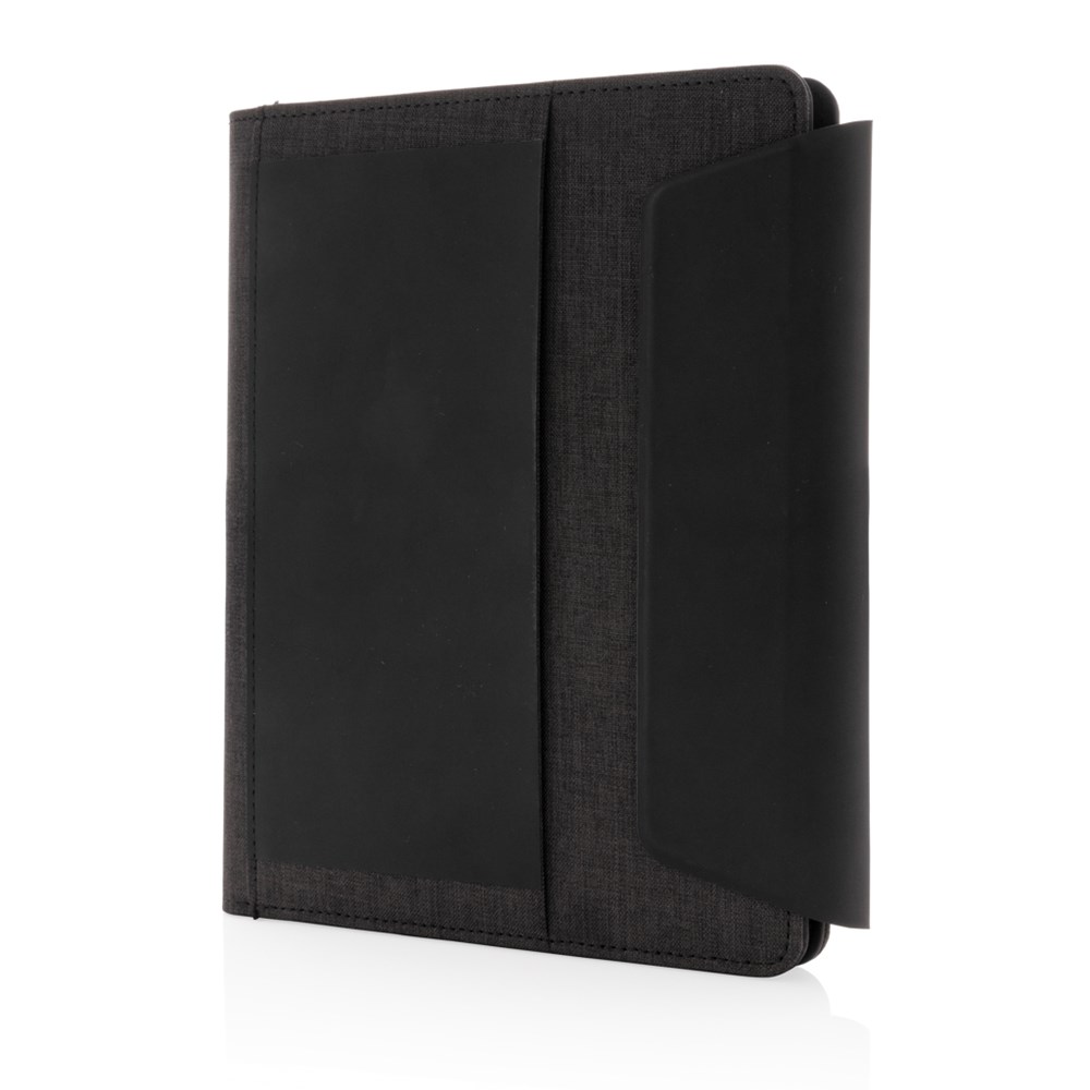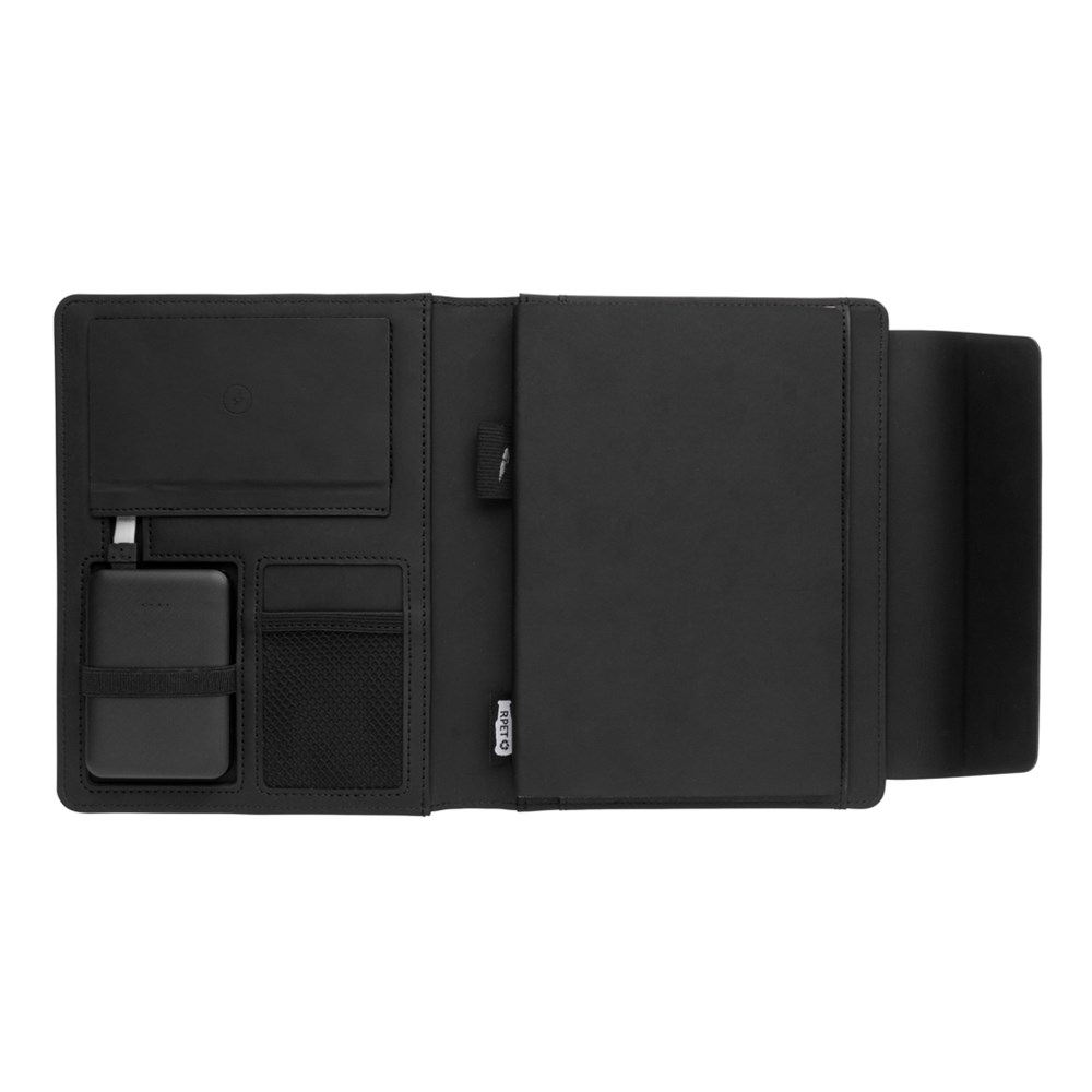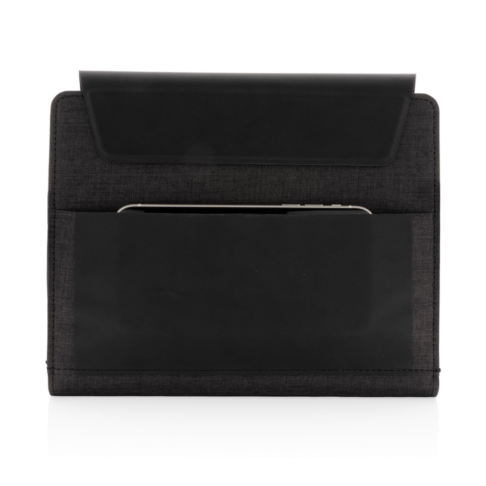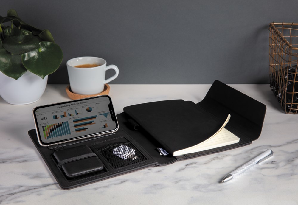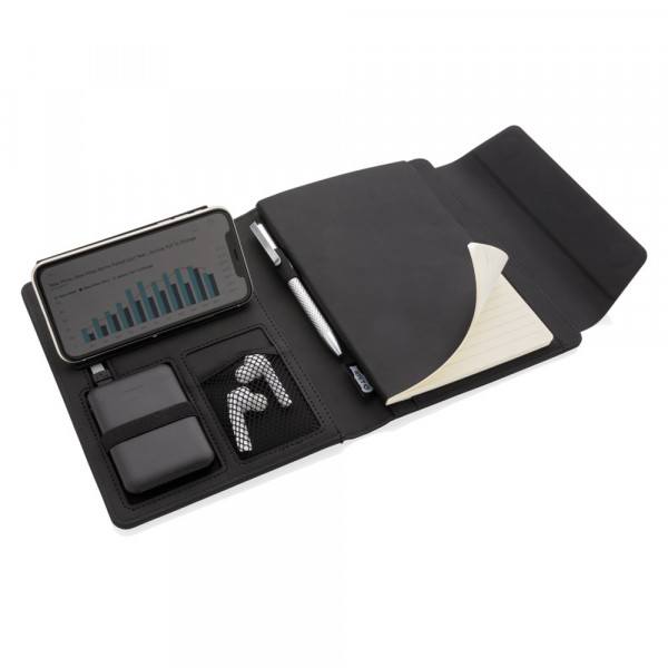 Schick und praktisch: Dieses A5 Portfolio mit integrierter Wireless Charging Funktion hat ebenso eine Powerbank die auch separat genutzt werden kann, sowie einen Wireless-Charging Telefonhalter, eine Stiftschlaufe und weitere Netzfächer. Das Notizbuch hat 64 Blätter/128 Seiten 70gr cremefarbenes, liniertes Papier. Hergestellt aus einem Materialmix aus Polyester und PU. Input: 5V/2A; Output:5V/2A. Wireless Input 5V/2A, Output 5V/1A. Verpackt in Geschenkbox.