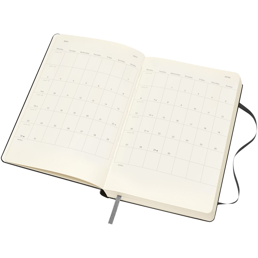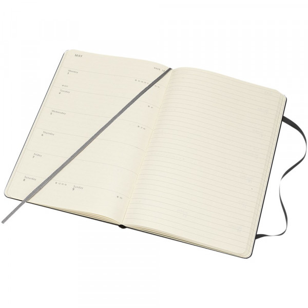 Moleskine Hardcover Wochenkalender, von Januar bis Dezember 2022 datiert. Die Wochenplanung auf der linken Seite und für Notizen oder spontane Ideen rechts eine linierte Seite. Mit elfenbeinweißem, säurefreiem Papier (70 g/m²), schwarzem Gummibandverschluss, Lesezeichenband und erweiterbarer Innentasche.