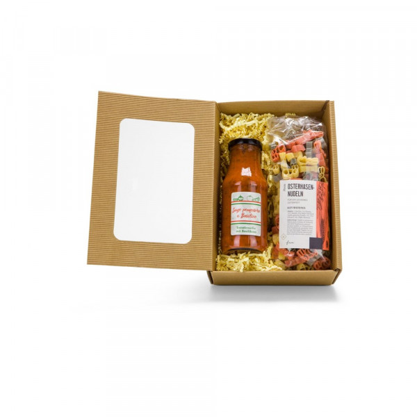 Wer an Ostern genug von all den süßen Naschereien hat, der findet in diesem Set eine gelungene Alternative: fröhliche Osternudeln (250 g) in Osterhasenform kombiniert mit einem Glas fruchtigem Sugo (250 ml). Alles gebettet auf cremefarbenem Sizzle und verpackt in einem naturfarbenen Geschenkkarton mit Sichtfenster.