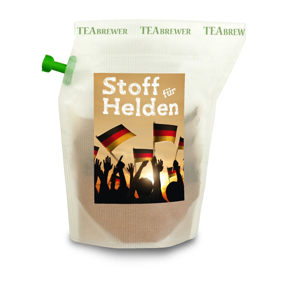 Sind Sie auch schon im Fußball-Fieber? Oder möchten Sie unser Olympia-Team anfeuern? Kleines Präsent, große Wirkung! Mit diesen hübschen Brühbeuteln lässt sich die Hektik des Alltags schnell vergessen. Einfach heißes Wasser einfüllen, ziehen lassen, durch den integrierten Filter ausgießen und genießen. Kein Instant-Produkt! Pure Vorfreude auf die nächste große Sportveranstaltung: egal ob die Olympischen Spiele oder eine Handball-, Basketball- oder Fußball EM oder WM - dieser Kaffee ist der richtige Jubelverstärker für unser Deutschland-Team! Passend dazu ein Etikett für echte Deutschland-Fans. Ideal auch für das Büro oder unterwegs. Ein Beutel ergibt zwei Tassen und kann wiederverwendet werden. Erhältlich in den Varianten "WM-Tee Earl Grey" & "WM-Kaffee" mit Fairtrade Bohnen aus Honduras.