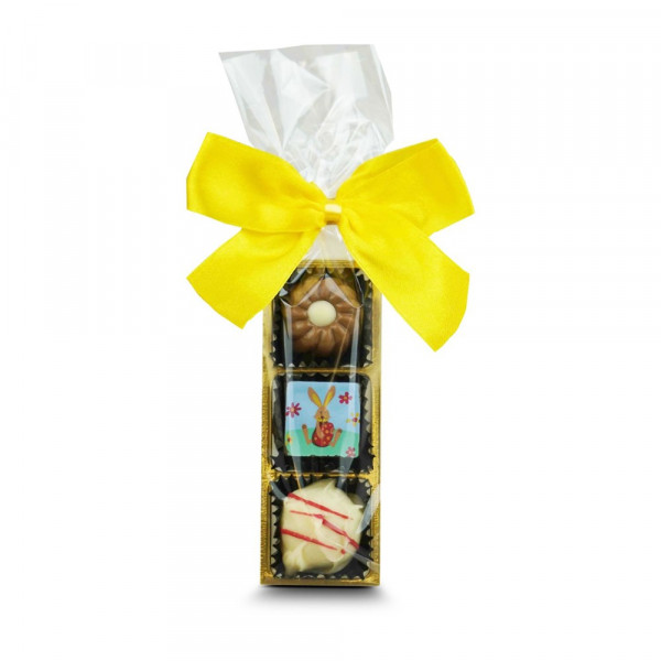 Diese österliche Pralinenstange mit hübscher Schleife ist ein nettes Präsent, welches von Herzen kommt und durch den Magen geht. Verschenken Sie 3 exklusive handgefertigte Confiserie-Pralinen (35 g) mit stimmungsvollem Dekor. Diese treffen bestimmt jeden Geschmack. Ohne Alkohol.