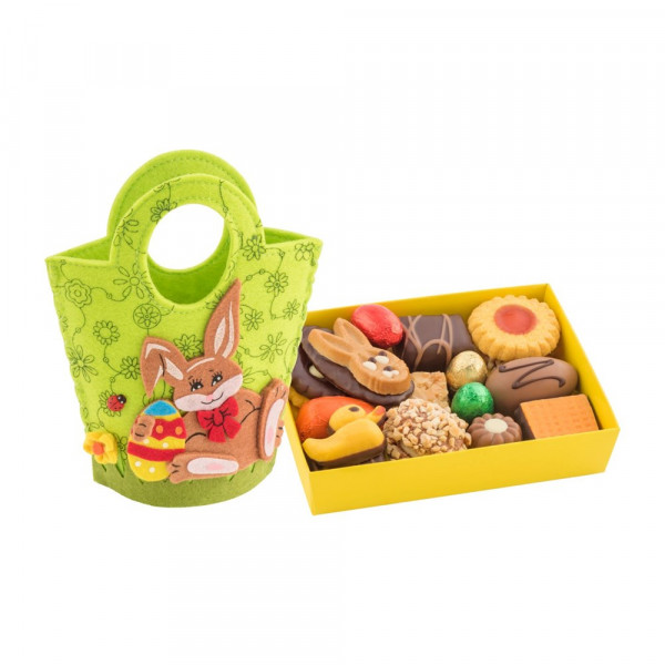 Diese süße grüne Filztasche ist gefüllt mit einer österlichen Gebäckmischung (200 g) in hochwertiger Confiseriequalität (Pralineneier, Gebäcke, Marzipanspezialitäten). Alles ist handwerklich hergestellt und frei von Konservierungsstoffen, Azo-Farbstoffen und genetisch veränderten Organismen.