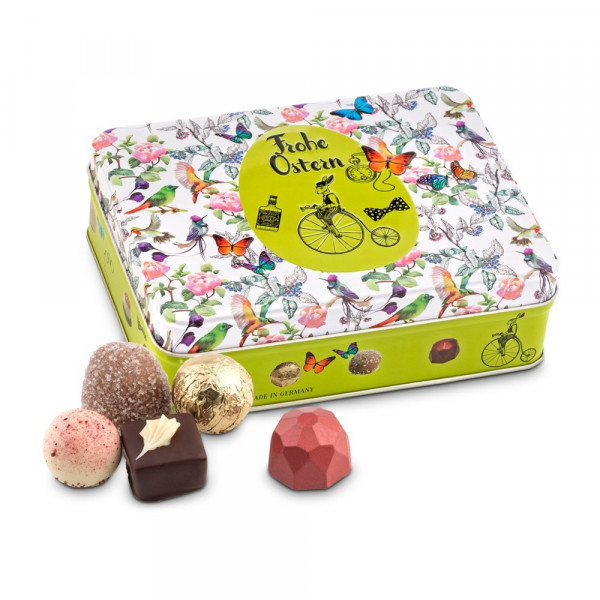 Pralinen-Vielfalt in einer fröhlichen Präsentdose: 10 ausgewählte Pralinen und Trüffel (z.T. mit Alkohol), handgemacht mit den besten Zutaten, verpackt in einer fröhlichen, österlichen Präsentdose. Hier ist jede Praline ein Unikat und ein Genuss für alle Sinne. Wählen Sie aus vier Motiven.