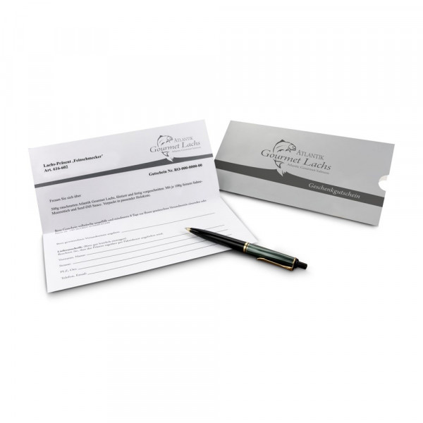 Gutschein für Lachs Geschenk "Feinschmecker": 500 g rauchzarter Atlantik Gourmet Lachs. Der Beschenkte kann selbst bestimmen, wann und zu welchem Anlass er sein exklusives Lachspräsent frisch geliefert bekommen möchte. Wir versenden das kulinarische Geschenk pünktlich zum Wunschtermin. Die angegebenen Preise beinhalten neben dem Präsent auch die Erstellung des Gutscheins, zzgl. für die Einzelversandzustellung bei den Beschenkten.