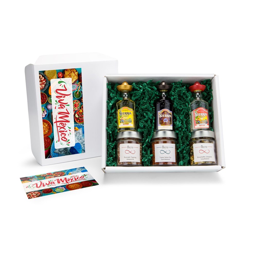 ¡Viva México! Feiern Sie eine kleine Fiesta mit 3 mexikanischen Mini Tequilas und dem Geschmack von Mexiko. Probieren Sie jeweils einen Sierra Tequila Gold, Silver und Tequila Café (je 4 cl) und dazu den Bruschetta Jalapeño Mix (90 g) auf einem Baguette, den Tapas Salsa Dip (85 g) zu Gemüse oder den Magic Barbecue Chili Mix zum Würzen und Verfeinern von Speisen und Gegrilltem (100 g). Das Set wird komplettiert durch einen Rezepteinleger mit Zubereitungshinweisen und einem weißen Geschenkkarton.