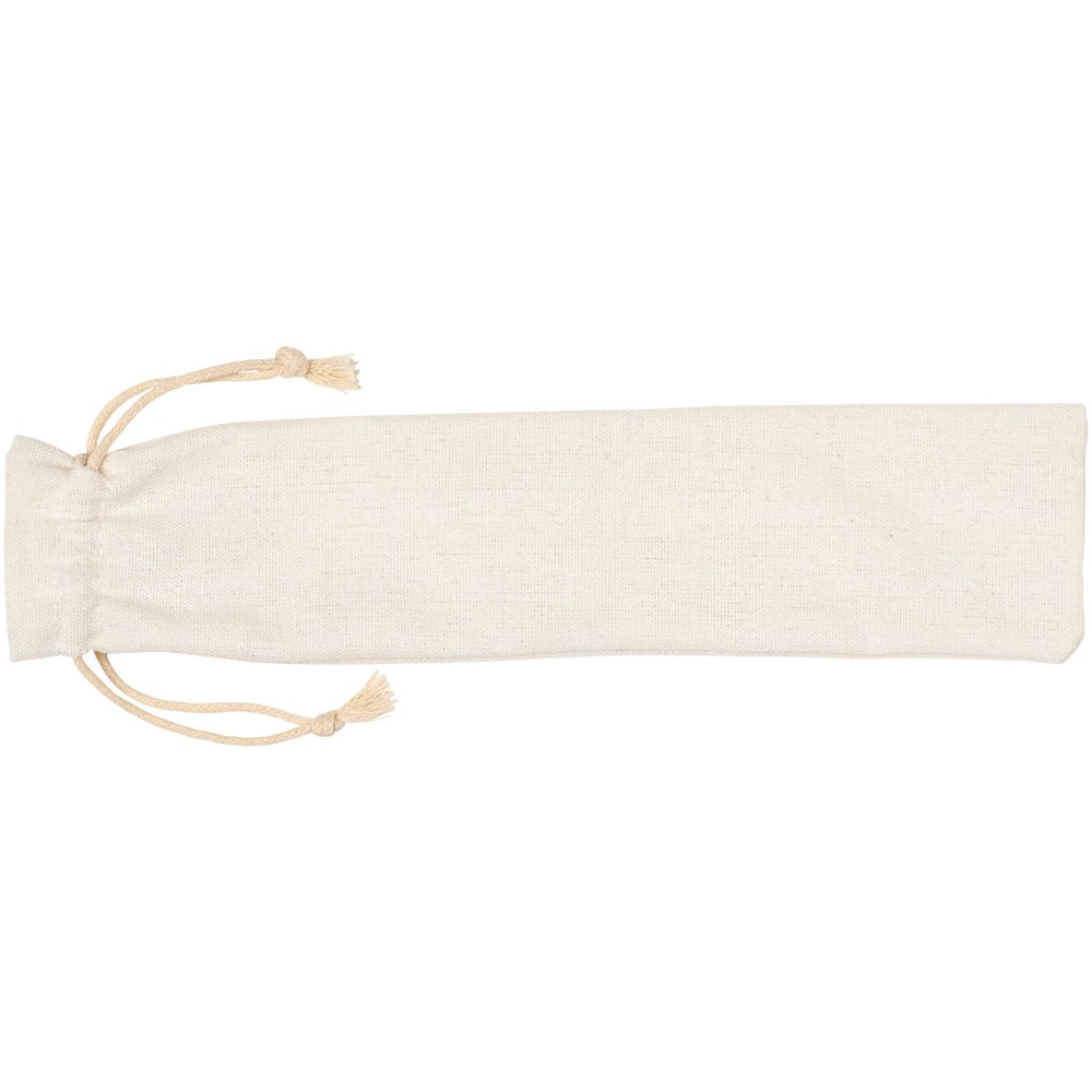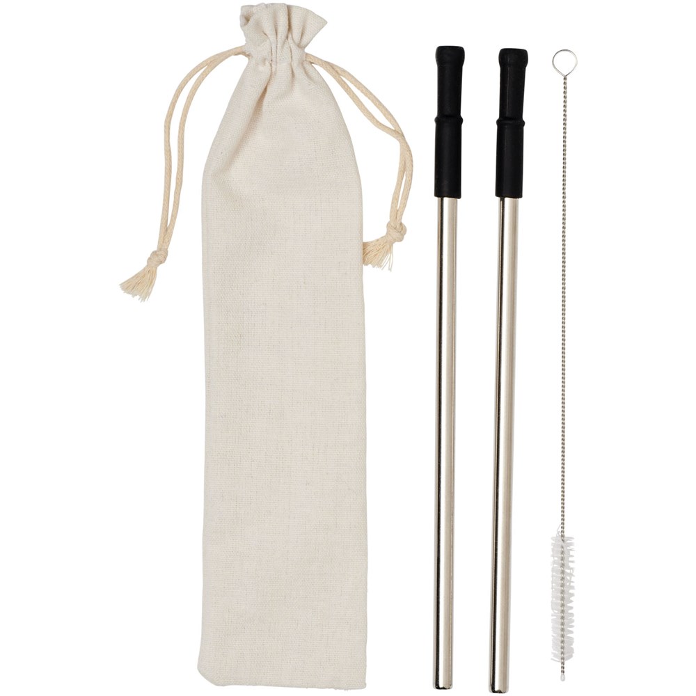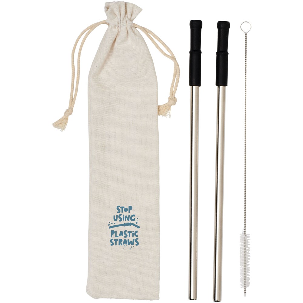 Zwei 21,5 cm lange Strohhalme aus Edelstahl, zwei Silikonspitzen, eine Strohhalmbürste und ein Baumwollbeutel. Die Strohhalme sind für kalte Getränke geeignet und spülmaschinenfest.