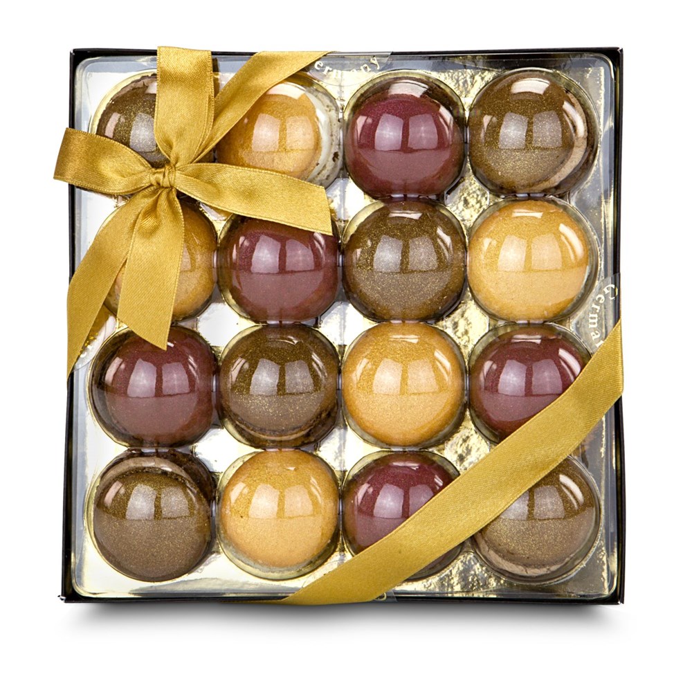 Lassen Sie sich von dieser französischen Spezialität verzaubern! Die 16 kleinen, runden und zarten Köstlichkeiten (150 g) bestehen aus zwei frisch gebackenen Baiserhälften mit zarter Cremefüllung in verschiedenen Sorten. Die Herstellung erfolgt unter Verwendung erlesener, natürlicher Zutaten aus den besten Anbaugebieten der ganzen Welt. Bei dieser glamourösen Spezialauflage glitzern alle Macarons in einem umwerfenden Gold. Verpackt im Blisterkarton mit Schleife.