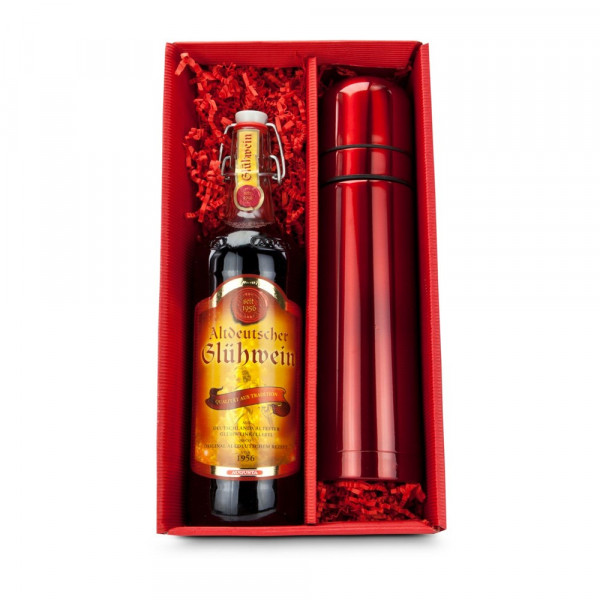 Rot in Rot: Die ROMINOX® Isolierkanne Cup in Cup (0,75 l) in Rot ist kombiniert mit einer Flasche Altdeutschem Glühwein (1 l) - und natürlich verpackt in einem roten Geschenkkarton, denn Rot ist die klassische Weihnachtsfarbe!