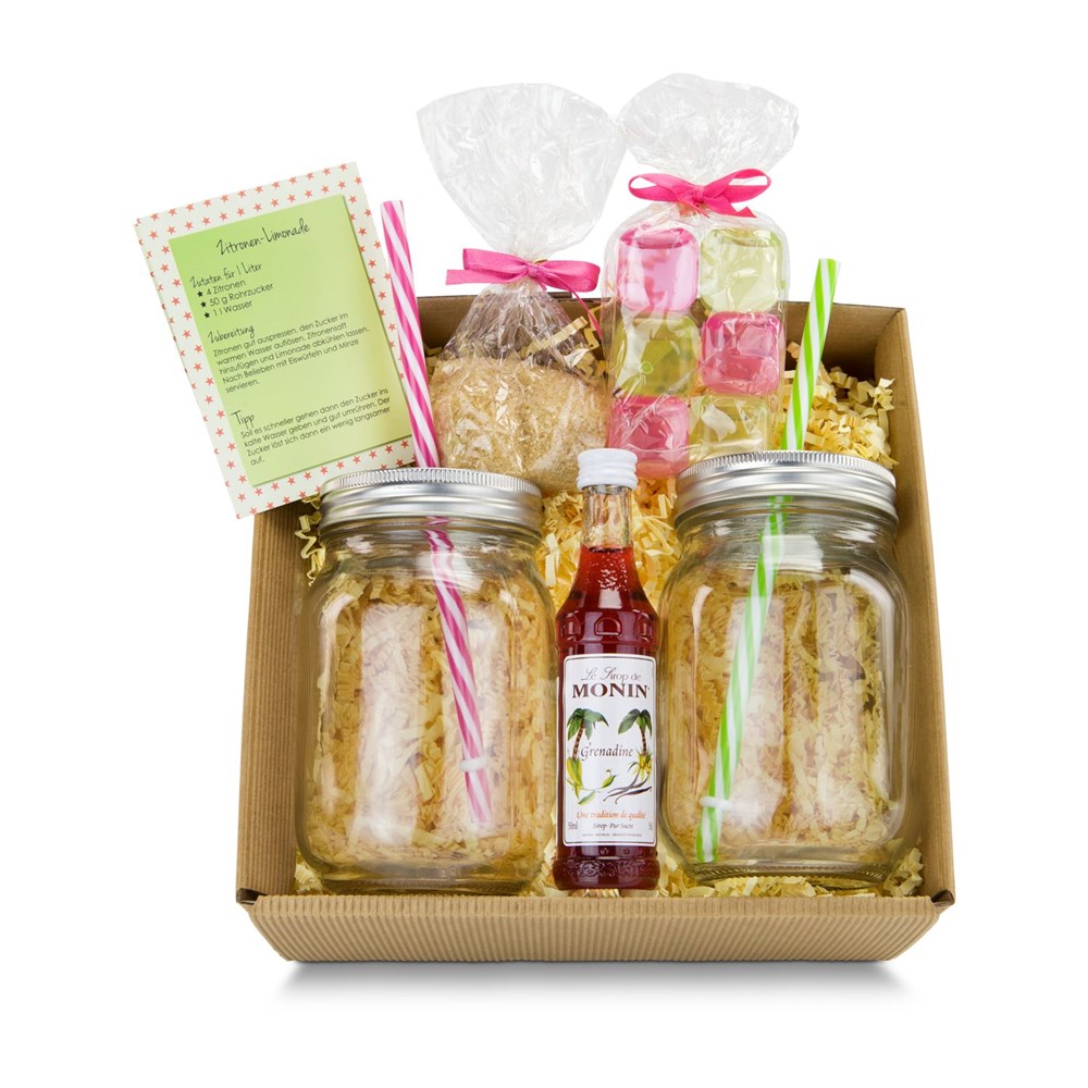 Eine topaktuelle Geschenkidee: Limonade ganz schnell selbst machen! Die 2 Gläser à 470 ml mit Deckel und Mehrweg-Strohhalm werden ergänzt durch 6 bunte, wiederverwendbare Eiswürfel, Rezeptkarte, Rohrzucker und ein Fläschchen Monin Sirup (50 ml). Nur noch frisches Wasser dazu und Sie können starten. Das Set ist geschmackvoll verpackt in einem naturfarbenen Geschenkkarton mit Sichtfenster.