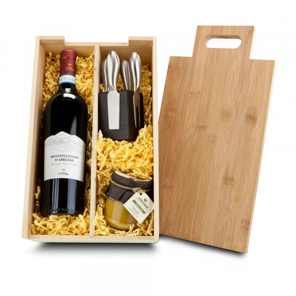 Eine pfiffige Idee und eine runde Sache! Die Rackpack® Verpackung hat einen sehr praktischen und schönen Zweitnutzen - denn der Deckel ist ein massives Käsebrett! Einfach abziehen - und dann zeigt sich das Innenleben der Holzkiste: Eine Flasche italienischer Montepulciano (0,75 l), ein Glas Feigensenf (190 ml) und ein ROMINOX®- Käsemesserblock. Käse und Trauben nur Deko. Rackpack Holzbox ohne Inhalt: 2A381