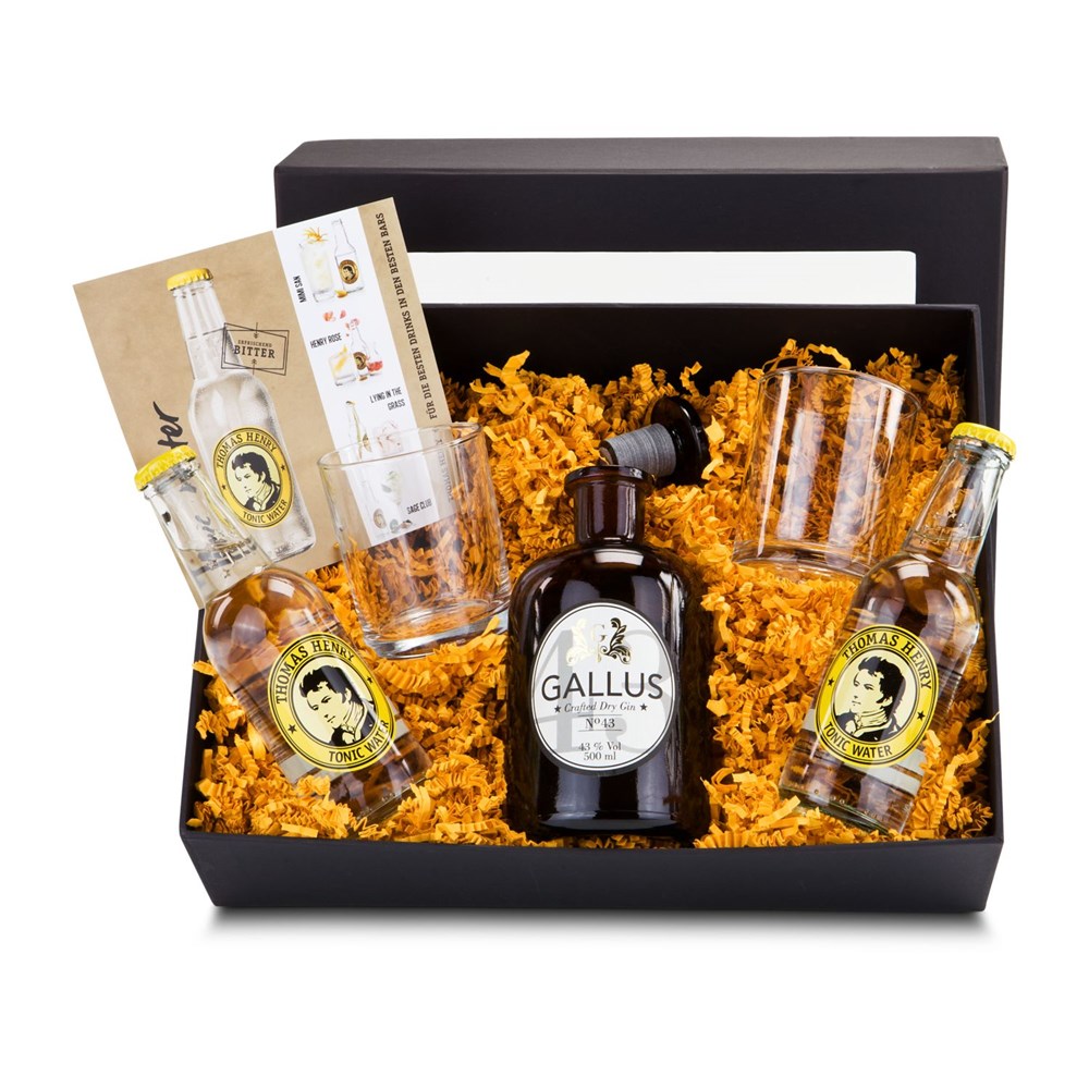 Ein exklusives Gin Tonic Set - etwas zum Entdecken, Schenken und Begeistern. Das absolute Trendgetränk in hochwertiger Kombination: Eine original braune Apothekerflasche mit 0,5 l Gin Gallus 43 und Glaskorken zum Wiederverschließen. Mit im Set liegen 2 Flaschen Tonic von Thomas Henry (à 0,2 l), eine Marke, die ebenfalls in Apothekertradition steht und daher perfekt zu unserem Gallus Gin passt. Dazu ein Rezept-Flyer mit Anregungen und 2 spezielle Gin Tonic Gläser. Im schwarzen Sichtfensterkarton. Das macht vom ersten Moment an Spaß!