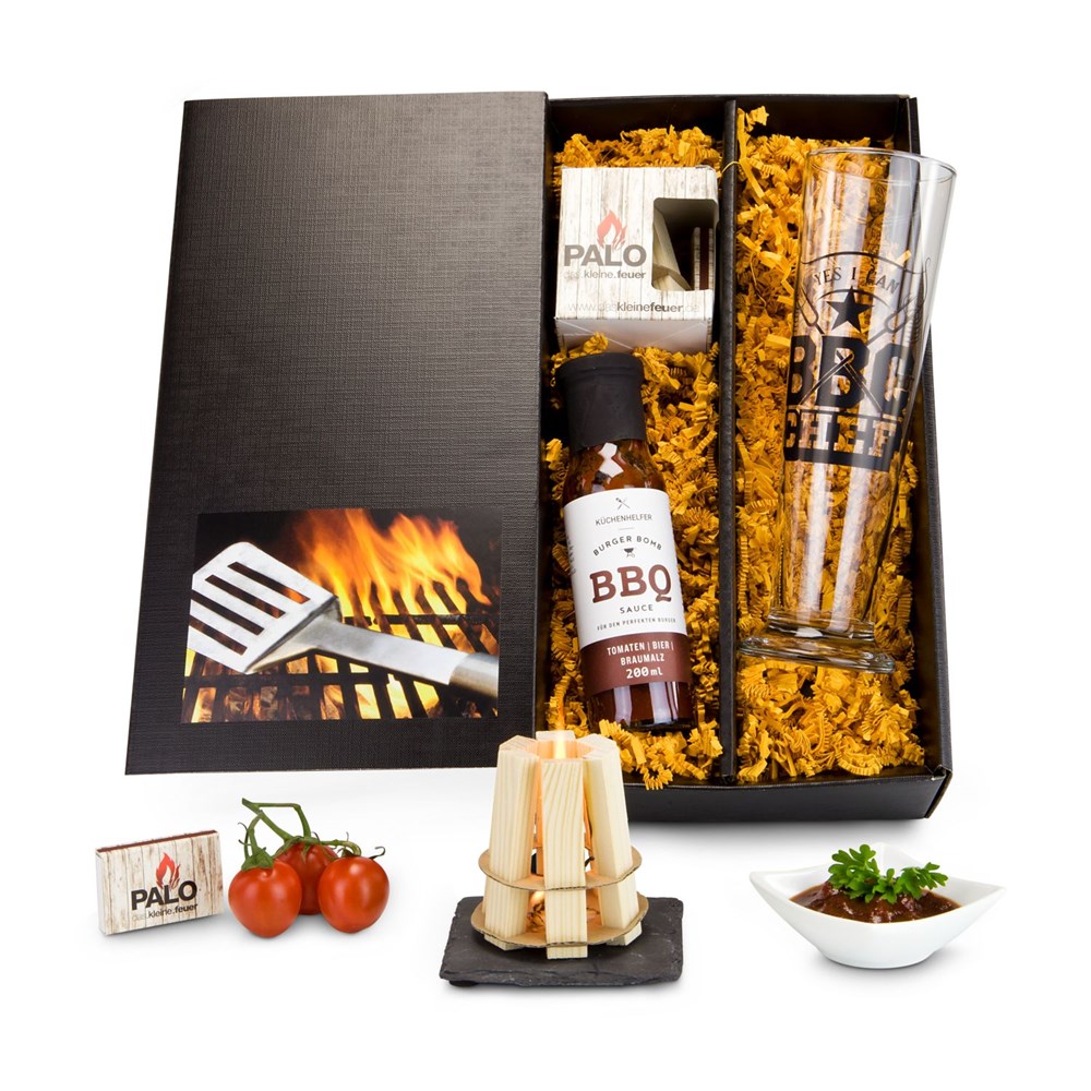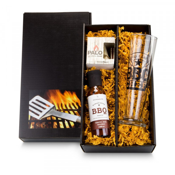 Ein Set für jeden "BBQ King" - und fühlt sich nicht jeder Mann als ein solcher? Ein Geschenk für Bier- und Grillfreunde gleichzeitig! Dieses Präsent enthält drei besondere Teile: ein Weißbierglas mit Spezialdruck "BBQ Chef", eine Flasche mit 200 ml BBQ Sauce mit Bier und dem angenehmen Geschmack von Braumalz und ein ganz besonderer Grillanzünder der Marke Palo (Brennzeit ca. 5 Minuten).