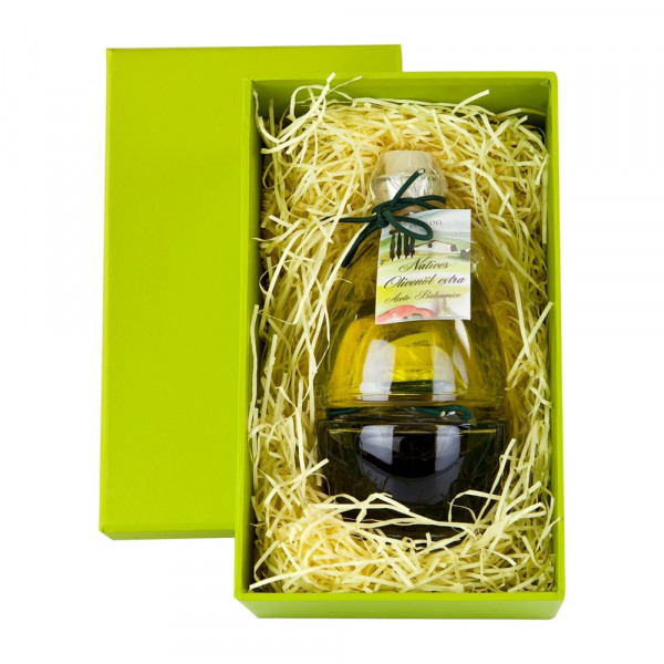 Ein gesundes und dekoratives Duo im schönen Gewand: eine originelle Flasche Aceto Balsamico (100 ml) und eine Flasche Olivenöl ‚Extra Vergine‘ (100 ml). Die Schmuckflaschen ergeben sowohl einzeln als auch gestapelt ein harmonisches Bild. Sie können immer wieder gefüllt werden und die hübsche grüne Schachtel ist ebenfalls vielseitig verwendbar. Damit wird Kochen zum Genuss!