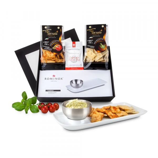 Dippen auf feine Art! Der ROMINOX® Servierteller Sorino mit Keramikteller und integrierter Edelstahl Schale für Saucen und Dips bietet dafür die ideale Grundlage. Damit es gleich losgehen kann beinhaltet dieses Geschenkset im schwarzen Geschenkkarton neben einem Tütchen Dipgewürz (einfach mit Quark oder Joghurt anrühren) noch je 200 g Kräcker Olive und Foccacette Pomodoro & Oregano.