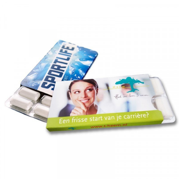 12 Stück zuckerfreier Sportlife®Kaugummi im Schuber alle 4 seiten konnen vollfarbig bedruckt werden. Ideal als ein erfrischendes Werbegeschenk auf, unter anderem, eine Ausstellung oder Veranstaltung als Besuch Karte, sondern auch als Dankeschön für die Hochzeit oder Geburtstag. Erhältlich ab 100 Stück.
