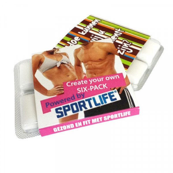 6 Stück zuckerfreier Sportlife®Kaugummi im Schuber alle 4 seiten konnen vollfarbig bedruckt werden. Ideal als ein erfrischendes Werbegeschenk auf, unter anderem, eine Ausstellung oder Veranstaltung als Besuch Karte, sondern auch als Dankeschön für die Hochzeit oder Geburtstag. Erhältlich ab 100 Stück.