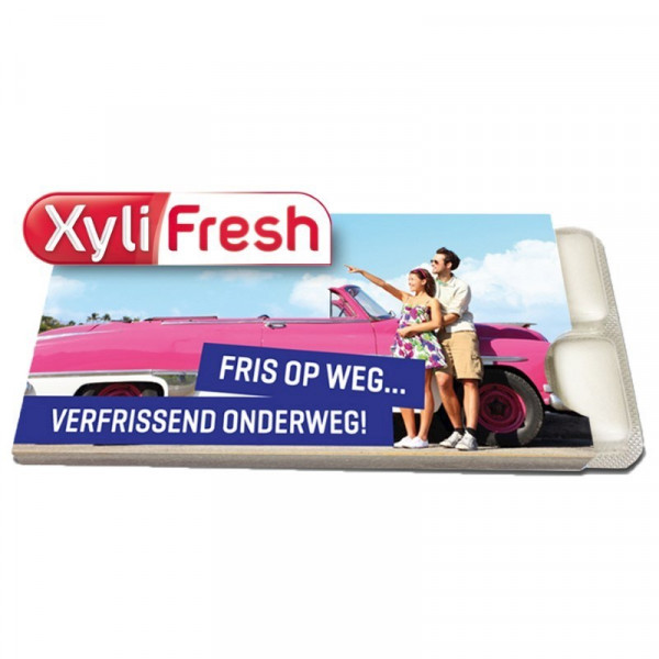 12 Stück zuckerfreier Xylifresh Kaugummi, 99% Xylitol. Xylitol wirkt zahnschonend, reduziert die Karies durch Bakterienabwehr, verhindert die Anhaftung von Zahnbelag und stellt den Zahnschmelz wieder her und verringert so das Risiko von Karies. Ideal als ein erfrischendes Werbegeschenk auf, unter anderem, eine Ausstellung oder Veranstaltung als Besuch Karte, sondern auch als Dankeschön für die Hochzeit oder Geburtstag. Erhältlich ab 100 Stück.