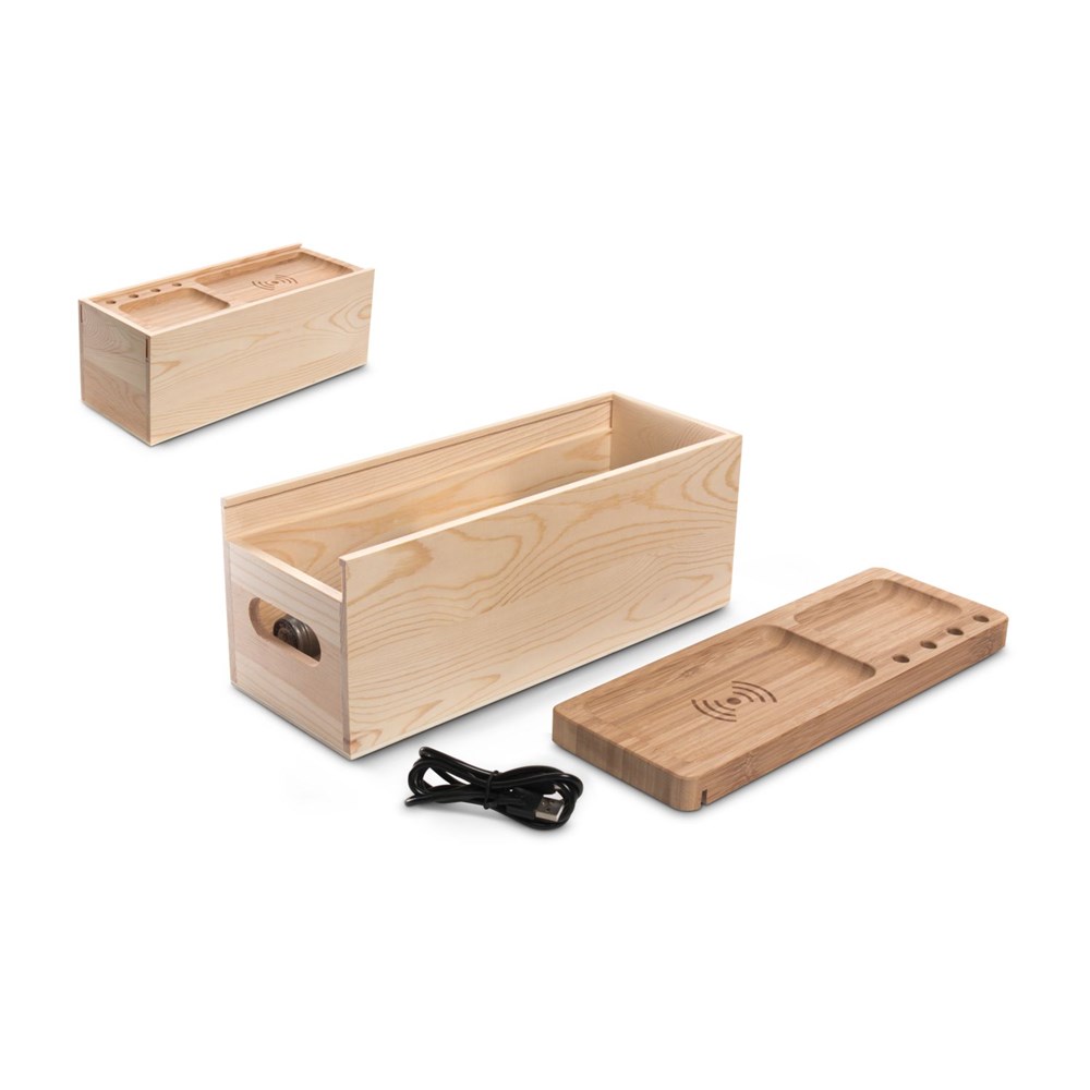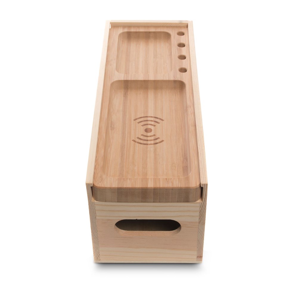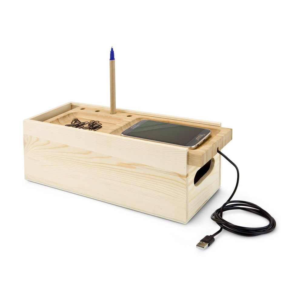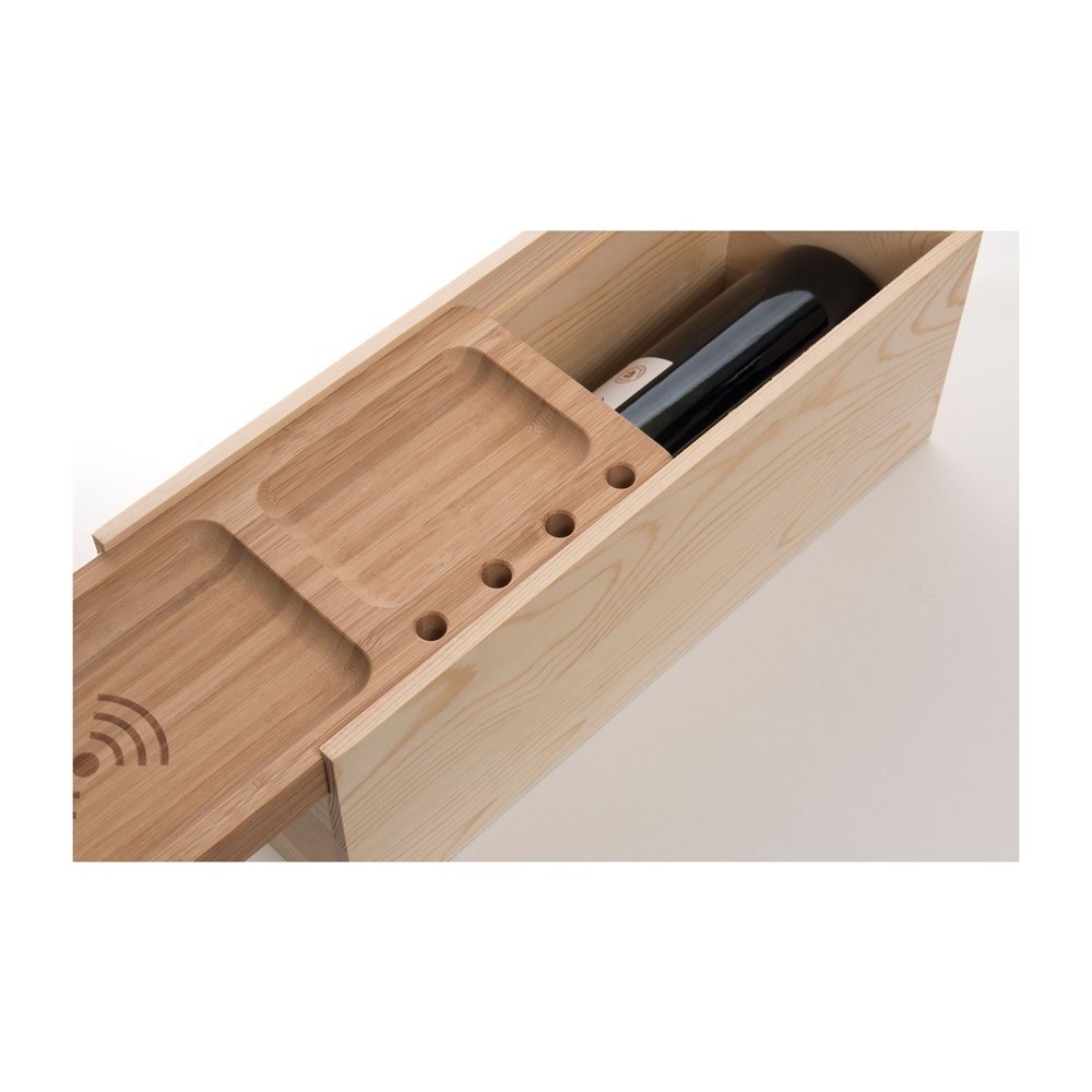 Die Juice Box ist viel mehr als eine klassische Verpackung für eine Flasche Wein! Der Schiebedeckel aus robustem Bambusholz, fungiert als kleiner Schreibtisch-Organizer für Kugelschreiber und kleine Gegenstände wie Geld oder Büroklammern. Das Highlight: eine induktive (drahtlose) Ladestation (QI-Standard), die man separat von der unteren Box nutzen kann. Einfach beiliegendes USB-Ladekabel anstecken, Handy auf die Ablage legen und laden. Eine geniale Idee für das Büro oder zuhause. (Funktioniert mit fast allen neueren Handys)