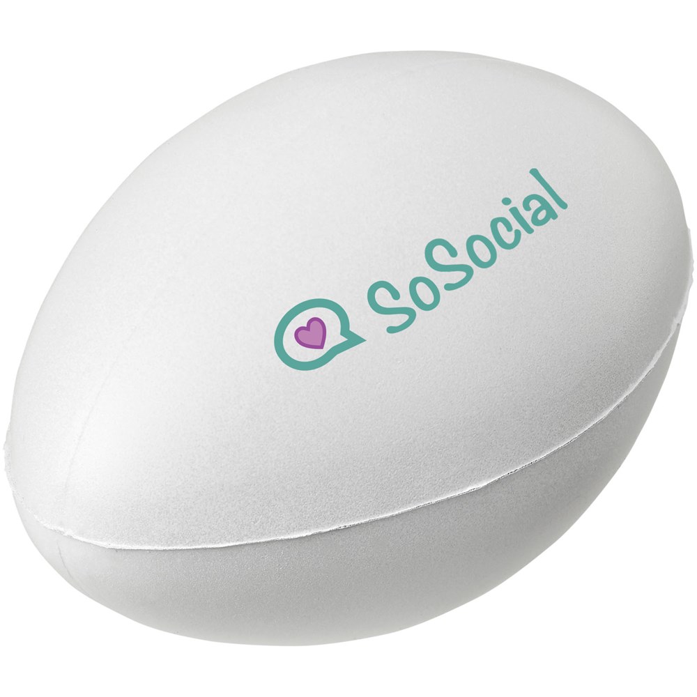 Rugby ball-shaped stress reliever with PU foam. Stress relievers vary slightly in density, color, size, and weight due to mold process which may prevent precise and uniform imprint. Imprint may break up.