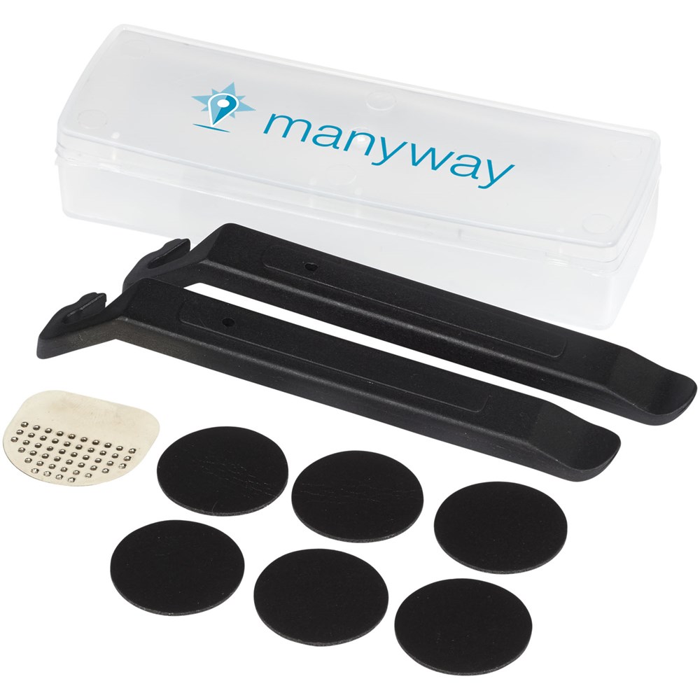 Reifenreparaturkit mit 2 rutschfesten Reifenhebern, Reifenraspel und 6 Flicken mit Klebstoff zum Reparieren von Löchern. Wird im Kunststoffetui geliefert.