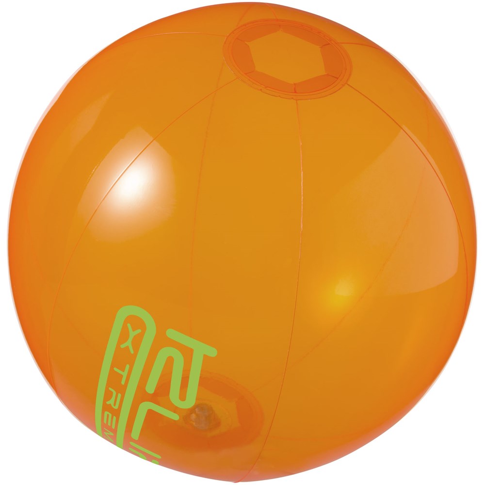 Einfarbiger, transparenter und aufblasbarer Wasserball. Im aufgeblasenen Zustand hat der Wasserball einen Durchmesser von ca. 25 cm, im unbefüllten Zustand sind es ca. 35 cm. Der erforderliche Warnhinweis ist um das Sicherheitsventil herum aufgedruckt. Große Werbeanbringungsfläche auf den Segmenten für maximale Sichtbarkeit des Logos. Entspricht EN-71, REACH und POP.