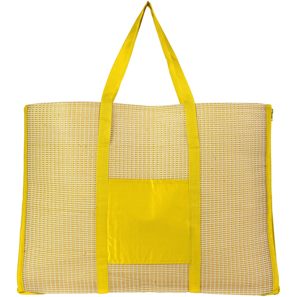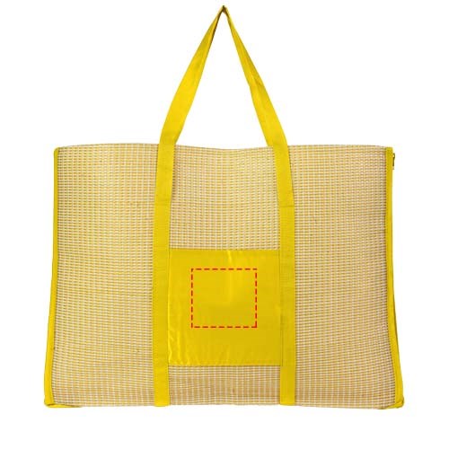 2-in-1-Strandmatte, die zu einer praktischen Tragetasche in der Größe 60 x 44 cm zusammengefaltet werden kann. Mit einer Tasche und einem aufblasbaren Kissen. Tragegriffhöhe 28 cm.