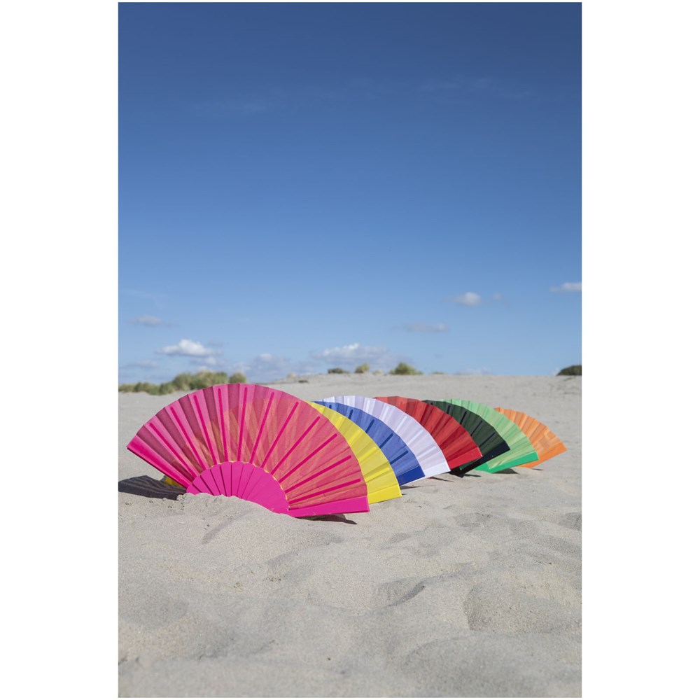 Faltbarer Handfächer, der an heißen Sommertagen für eine kühle Brise sorgt. Dieses einladende Geschenk ist in einer Vielzahl von Farben erhältlich und in einer Geschenkbox verpackt. Aufgrund seiner Konstruktion und der Verwendung können bei dieser Art von Produkt kleine Kratzer entstehen.
