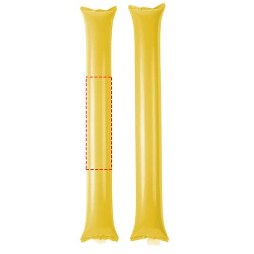 Zwei aufblasbare Klatschstangen. Ideales, wiederverwendbares Produkt zur Unterstützung Ihres Teams. Jede Stange hat eine Größe von 60 x 10 cm mit einem großen Werbeanbringungsbereich. Zur Befüllung mit Luft den mitgelieferten kleinen Strohhalm in die Öffnung der Klatschstange einführen.