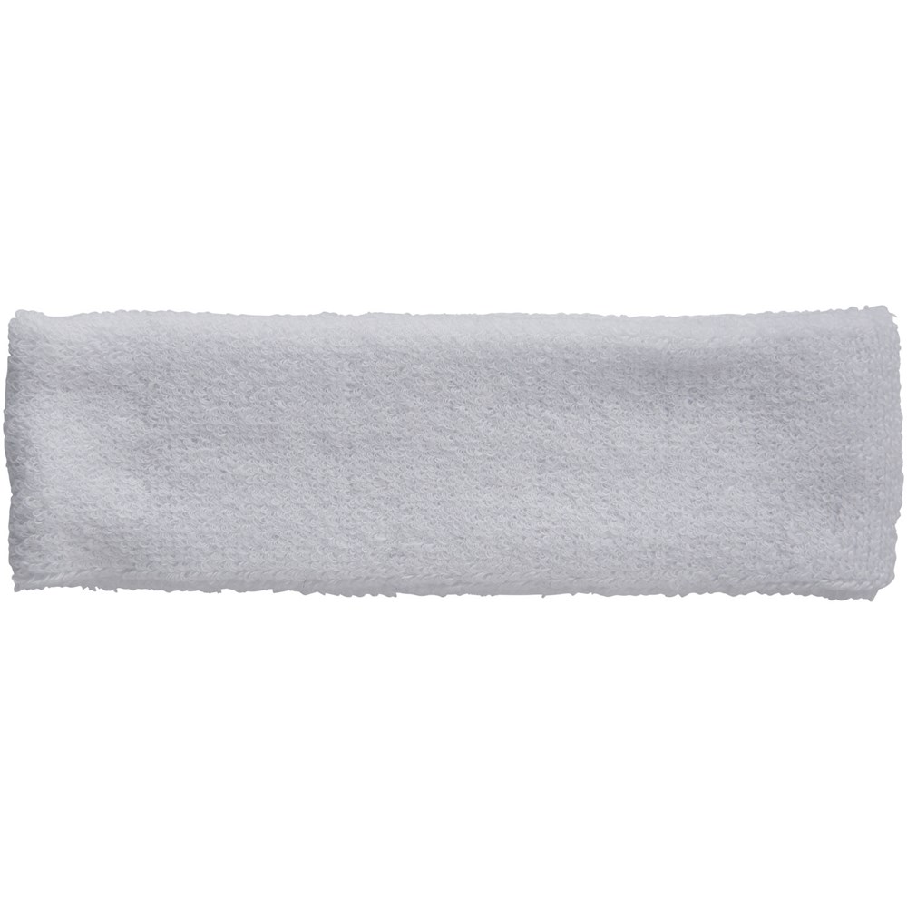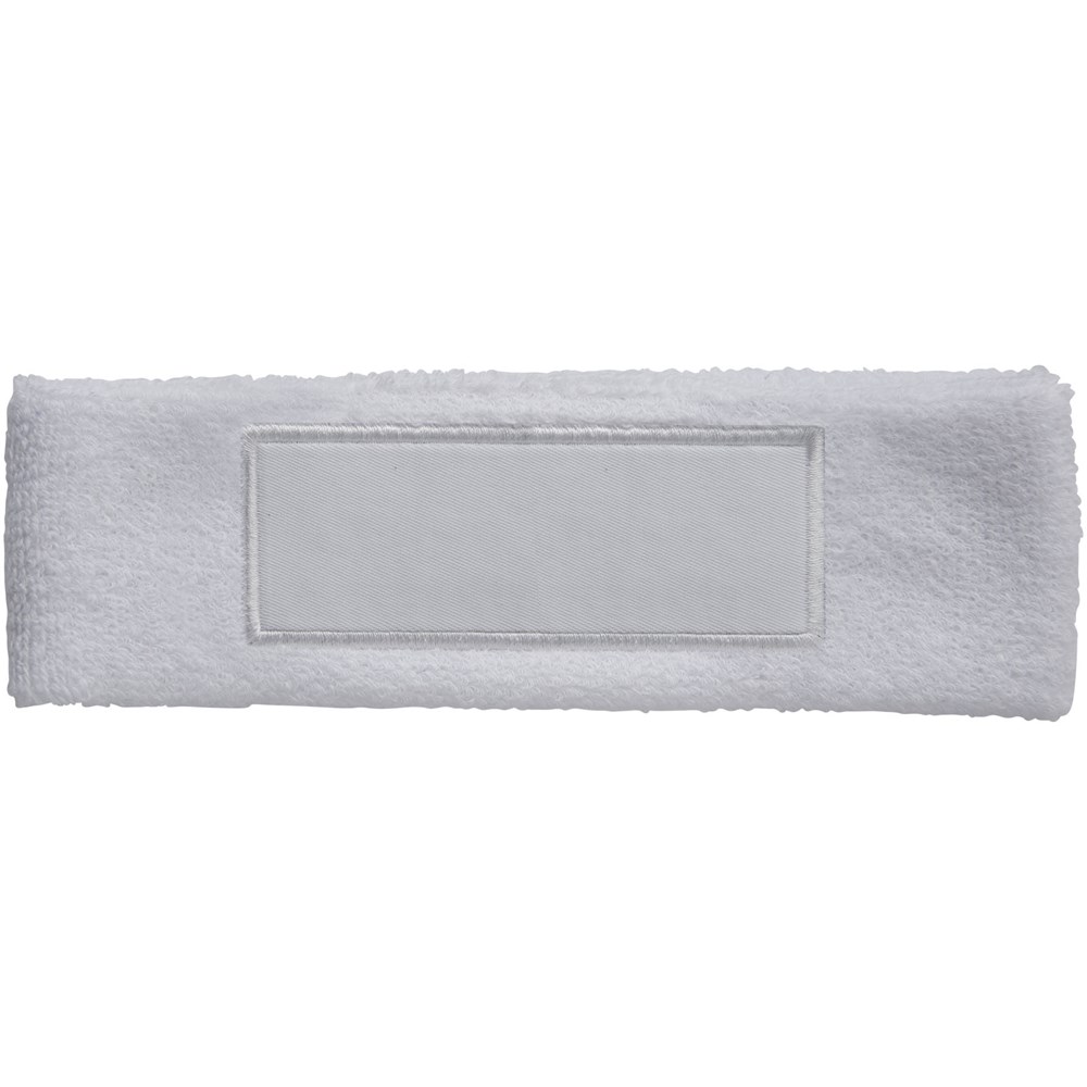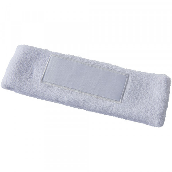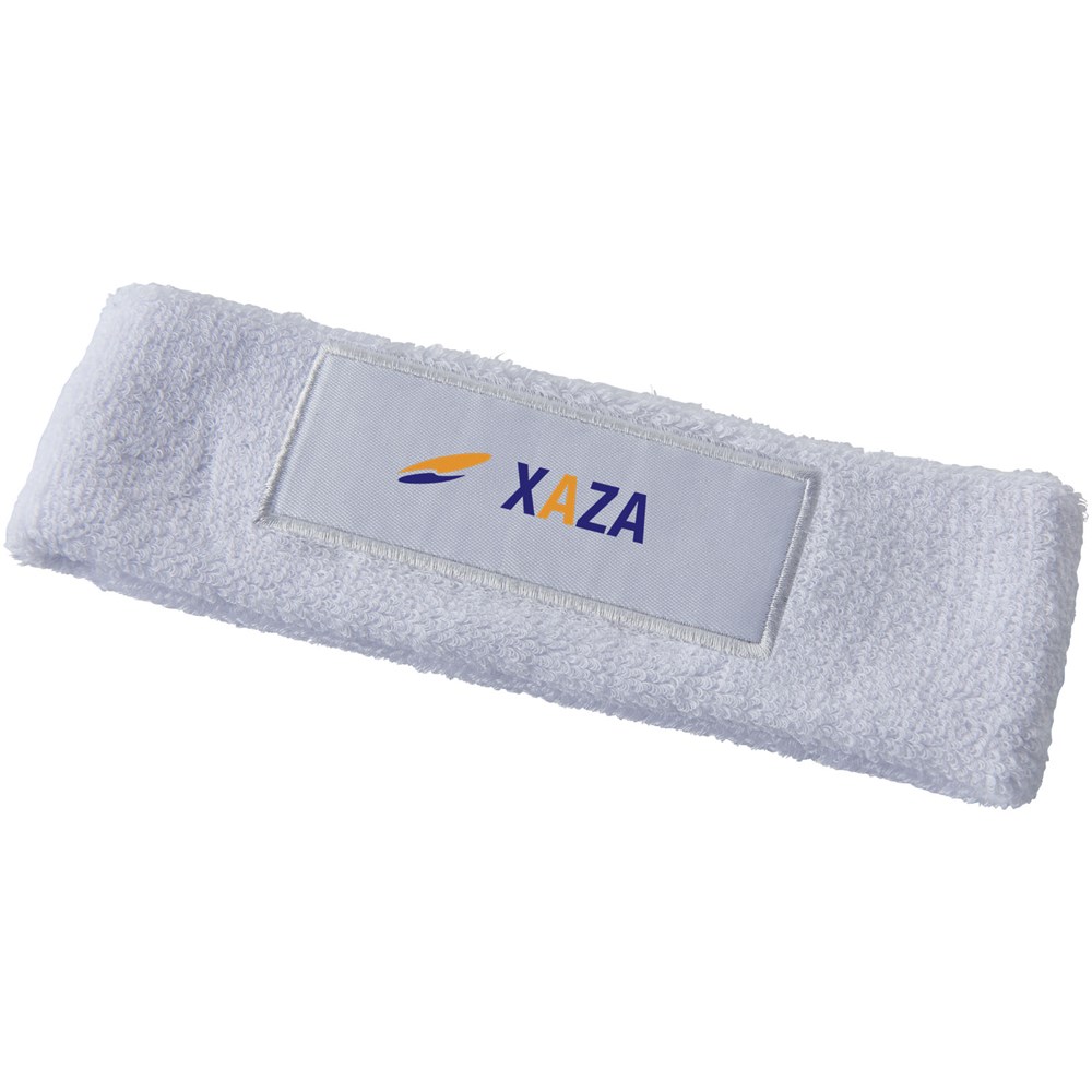Weiches und saugfähiges elastisches Baumwoll Stirnband mit rechteckigem 90x30mm Aufnäher für Werbeanbringung.