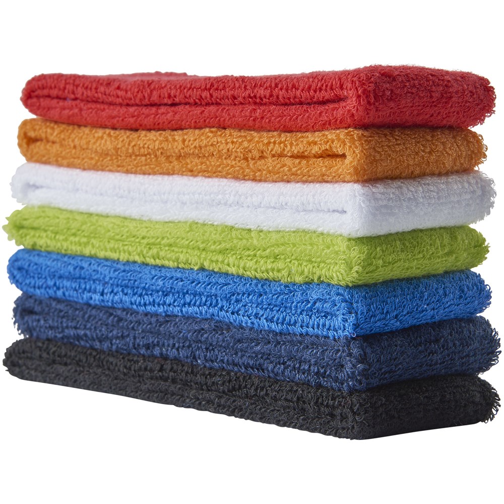 Weiches und saugfähiges elastisches Baumwoll Stirnband mit rechteckigem 90x30mm Aufnäher für Werbeanbringung.