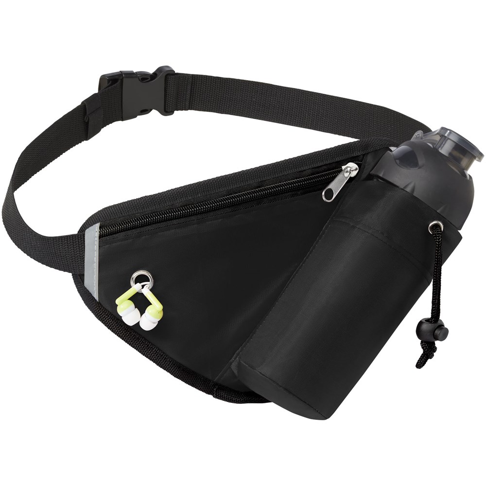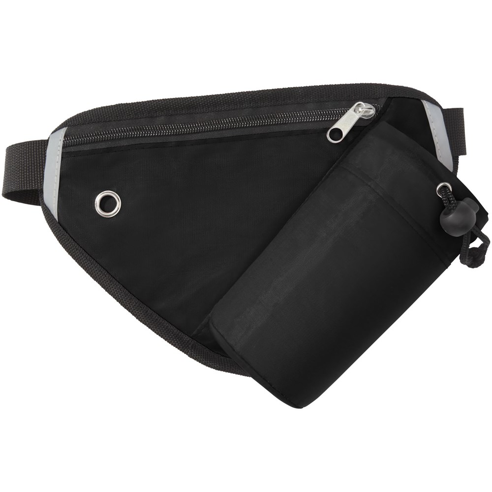 Dreieckige Multifunktionstasche mit gepolsterter Rückseite. Ausgestattet mit Reißverschlusstasche, Kopfhörerausgang, reflektierenden Elementen, verstellbarem Bund mit Schnallenverschluss und einem verstellbaren Sportflaschenbeutel mit Aluminiumfolie im Inneren, um Ihre Getränke kühl zu halten. In die Tasche passen Trinkflaschen mit einem Durchmesser bis zum 7,5 cm. Sportflasche nicht im Lieferumfang enthalten. Große Dekorationsfläche auf der Vorderseite.