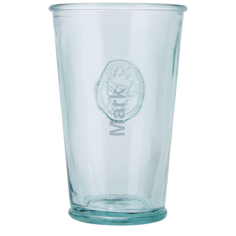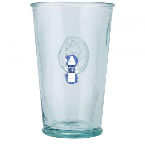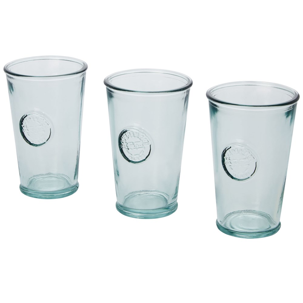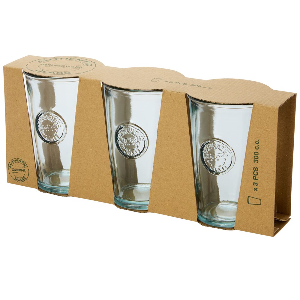 3-teiliges Set aus recyceltem Glas mit drei Bechern, jeweils 300 ml. Hergestellt aus 1 Glasflasche. Recyceltes Glas wird mit weniger Energie, Rohstoffen und Additiven hergestellt als für die Herstellung von herkömmlichem Glas erforderlich. Bechergröße: Höhe 13 cm, Durchmesser 8 cm.