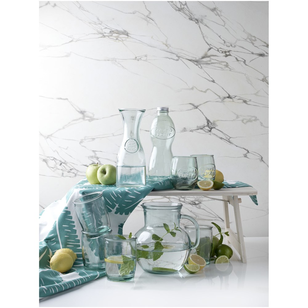 5-teiliges Set aus recyceltem Glas mit einem 2,3-Liter-Krug und vier 430-ml-Tassen. Hergestellt aus 5 Flaschen aus Glas. Recyceltes Glas wird mit weniger Energie, Rohstoffen und Additiven hergestellt als für die Herstellung von herkömmlichem Glas erforderlich.