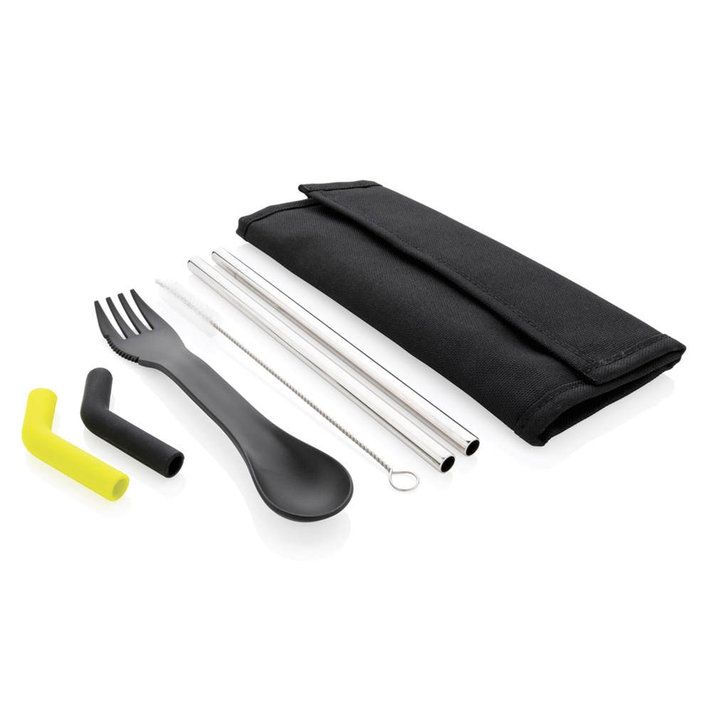Das Tierra 2-teilige Trinkhalm- und Besteckset ist das ideale Set für unterwegs, wenn Sie weniger Einwegkunststoff verwenden möchten. Das Set enthält 2 Stainless-Steel Trinkhalme, eine Reinigungsbürste, einen Göffel und 2 gebogene Silikonaufsätze, die für optimalen Komfort beim Trinken Ihres Getränks am geraden Trinkhalm befestigt werden. Die 2 verschiedenen Farben erleichtern es Ihnen, sie voneinander zu unterscheiden. Verpackt in einer praktischen Tasche mit Klettverschluss. Spülmaschinenfest. Außen 100% 600D Polyester, Innen 100% 210D Polyester. PVC-frei.