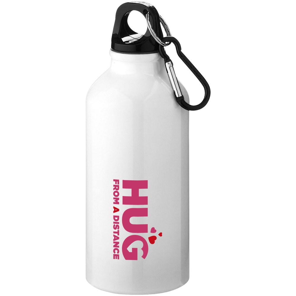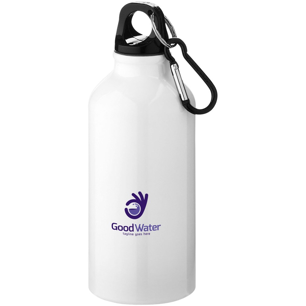 Einwandige Flasche mit Schraubverschluss. Karabiner ist nicht für das Klettern geeignet. Volumen 400ml.