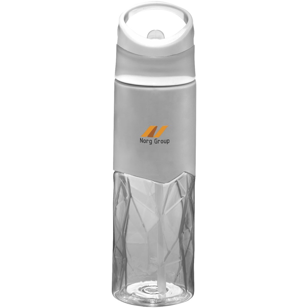 Einwandige Flasche in geometrischer Form mit weichem Griffbereich zur Logo-Anbringung. Schraubdeckel verfügt über Griff und hochklappbarem Strohhalm. Volumen 830 ml. Verpackt in einem Geschenkkarton.