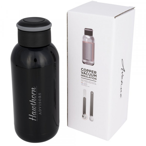 Flasche aus doppelwandigem Edelstahl mit Vakuum-Isolierung. Die Innenwand ist für ultimative Leitfähigkeit mit Kupfer beschichtet, um Getränke 8 Stunden heiß und 48 Stunden kalt zu halten. Schraubverschluss mit integriertem Silikonriemen. Breite Öffnung für einfaches Reinigen und Befüllen. Das Fassungsvermögen beträgt 350ml. Präsentiert in einer Avenue Geschenkschachtel.