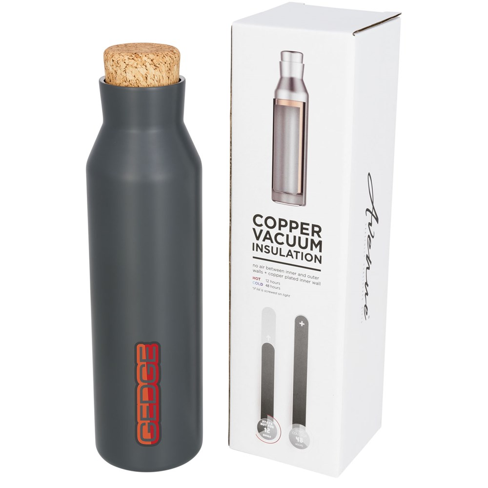 Robuste, doppelwandige Edelstahl-Vakuumkonstruktion mit Kupferisolierung, welche dafür sorgt, dass Ihr Getränk 12 Stunden lang heiß und 48 Stunden lang kalt bleibt. Die Konstruktion verhindert auch eine Kondensation auf der Außenseite der Flasche und der Deckel ist verschüttungsresistent. Die Flasche verfügt über ein innovatives Schraubdeckel-Design in Kork-Optik. Passend für die meisten gängigen Auto-Getränkehalterungen. Das Fassungsvermögen beträgt 590ml. Verpackt in einer Avenue Geschenkbox.