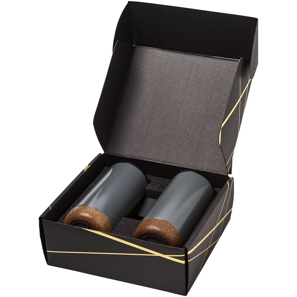 Geschenkset mit zwei vakuumisolierten Kupferbechern Valhalla (500 ml). Präsentiert in einer schwarzen Geschenkbox mit glänzenden goldfarbenen Details.