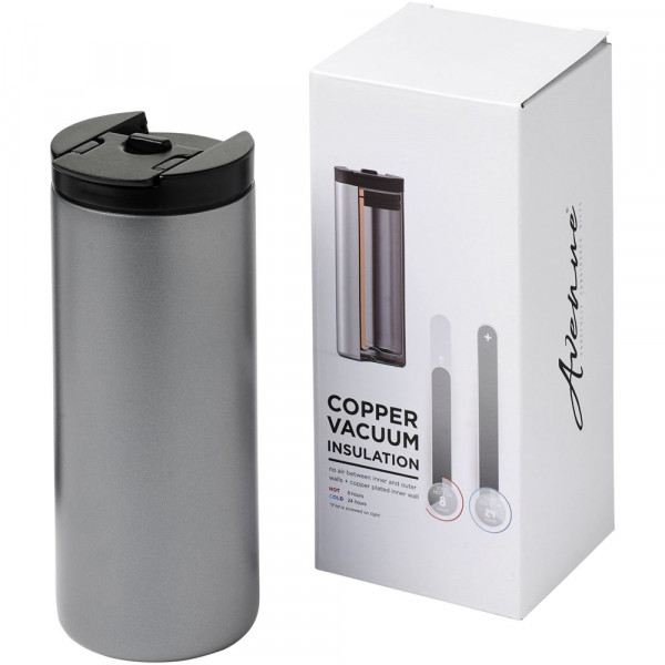 Ein kompakter und langlebiger Becher, der sich ideal für Arbeit oder Reisen eignet. Der Becher verfügt über eine doppelwandige Vakuum-Konstruktion mit Kupfer-Isolierung, was bedeutet, dass er Getränke 8 Stunden heiß und 24 Stunden kalt hält. Der Deckel hat eine Verriegelungsfunktion. Die Konstruktion verhindert außerdem Kondenswasser auf der Außenseite des Bechers. Das Fassungsvermögen beträgt 360 ml. Präsentiert in einer Avenue-Geschenkschachtel.