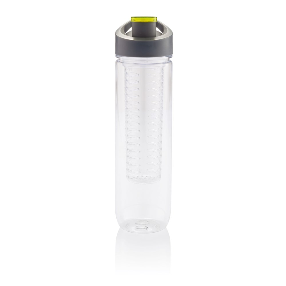 800ml Tritan Flasche mit Früchte-Aromafach. Bereichern Sie Ihr Wasser mit Vitaminen und einer Menge Geschmack durch das einfache Hinzufügen von frischen Früchten im Aromafach. Dieses Fach kann durch das Zusetzen von Eiswürfeln auch als Kühlfach verwendet werden. Nur Handwäsche.