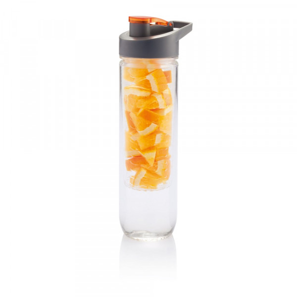 800ml Tritan Flasche mit Früchte-Aromafach. Bereichern Sie Ihr Wasser mit Vitaminen und einer Menge Geschmack durch das einfache Hinzufügen von frischen Früchten im Aromafach. Dieses Fach kann durch das Zusetzen von Eiswürfeln auch als Kühlfach verwendet werden. Nur Handwäsche.