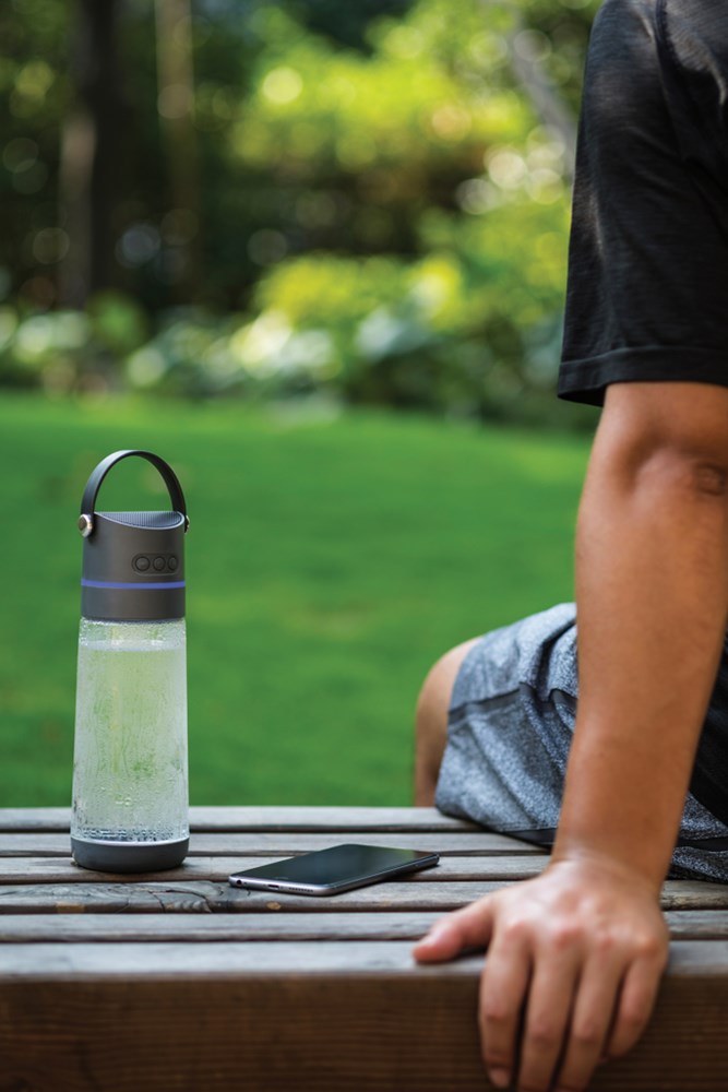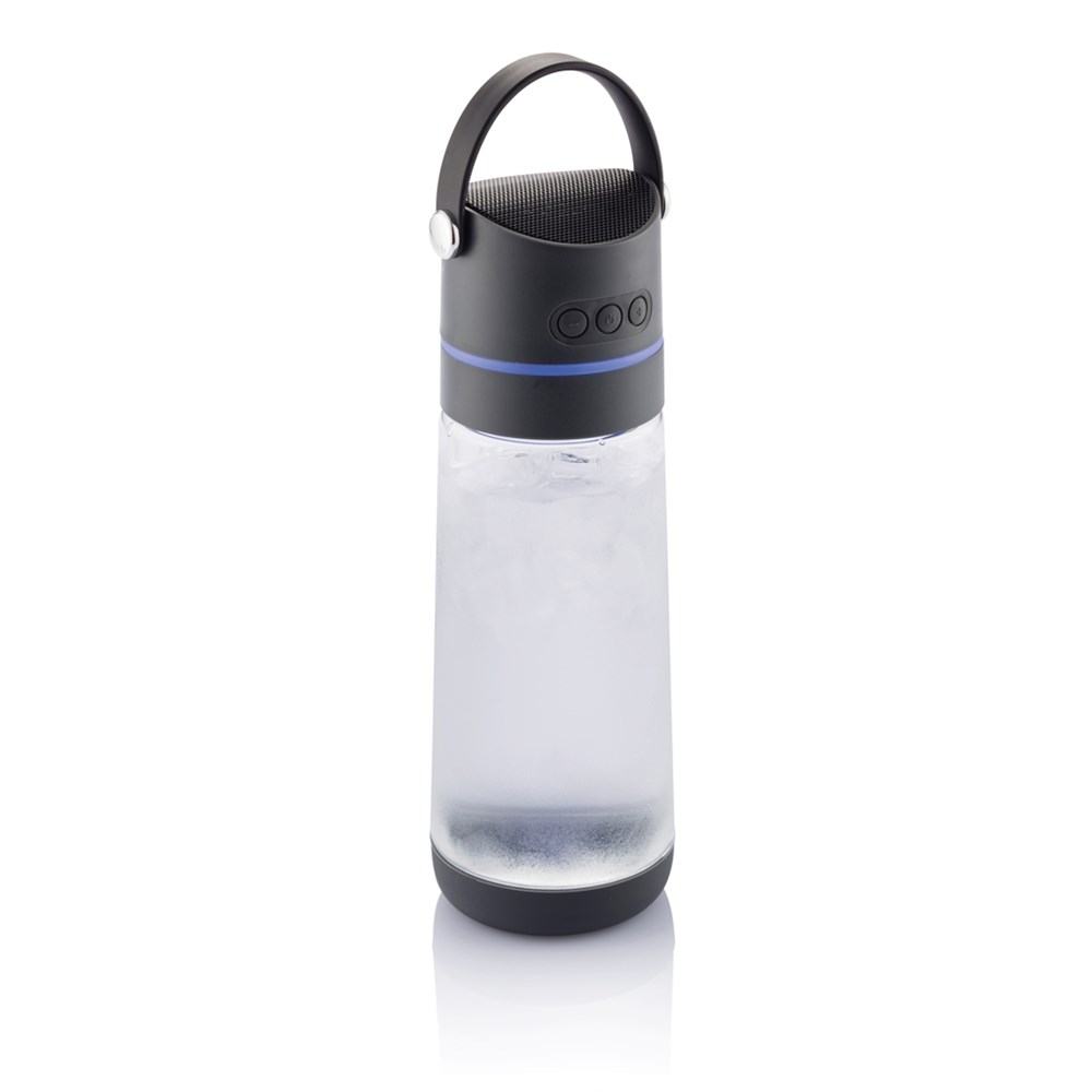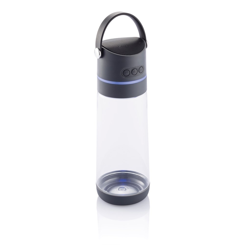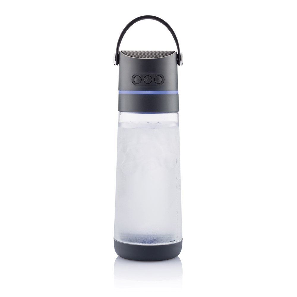 Langlebige Tritan Flasche mit kabellosem 3W Lautsprecher und Moodlight Die Batterie hat 450 mAh. Perfekt für draußen, unterwegs und zum Sport. Auslaufsicher und mit Trageriemen. 700ml Inhalt. Nur Handwäsche. Geschütztes Design®