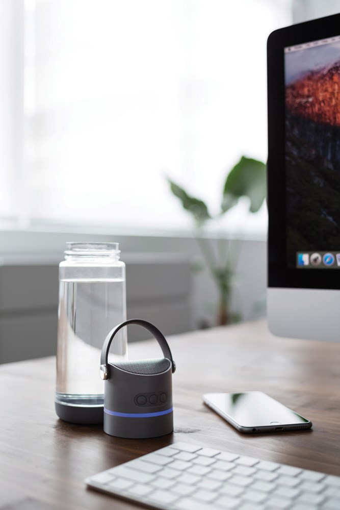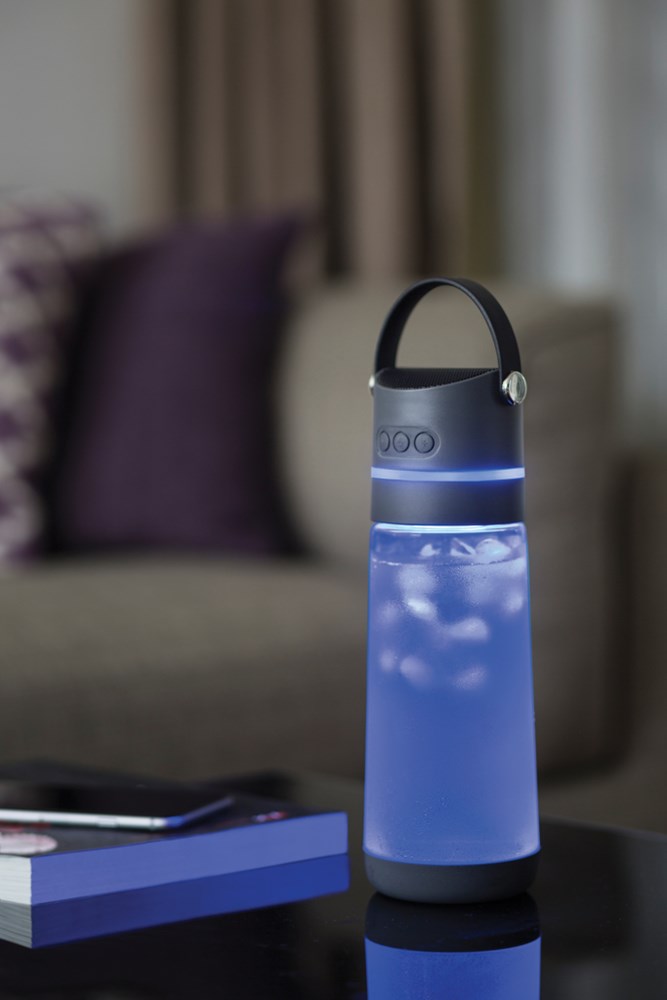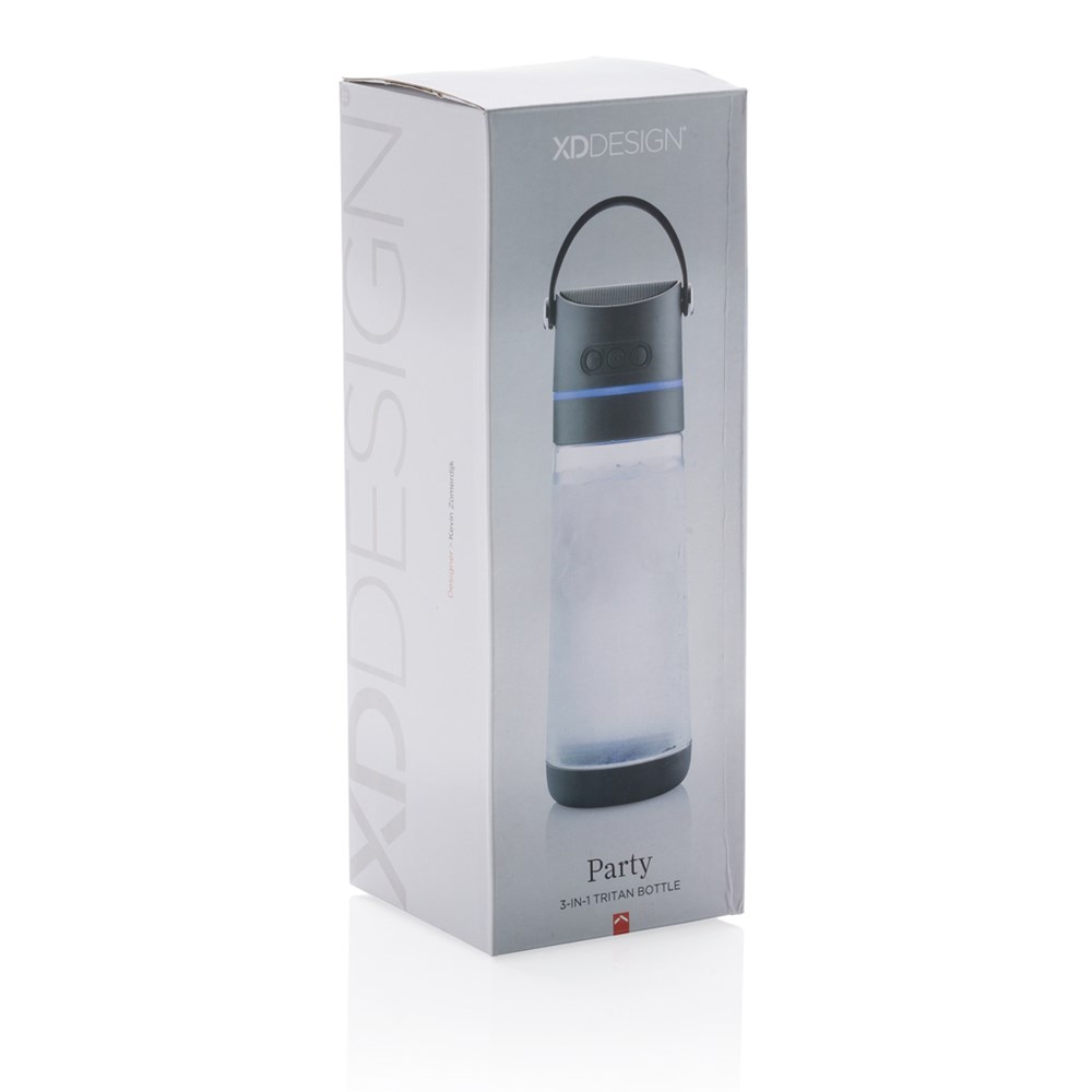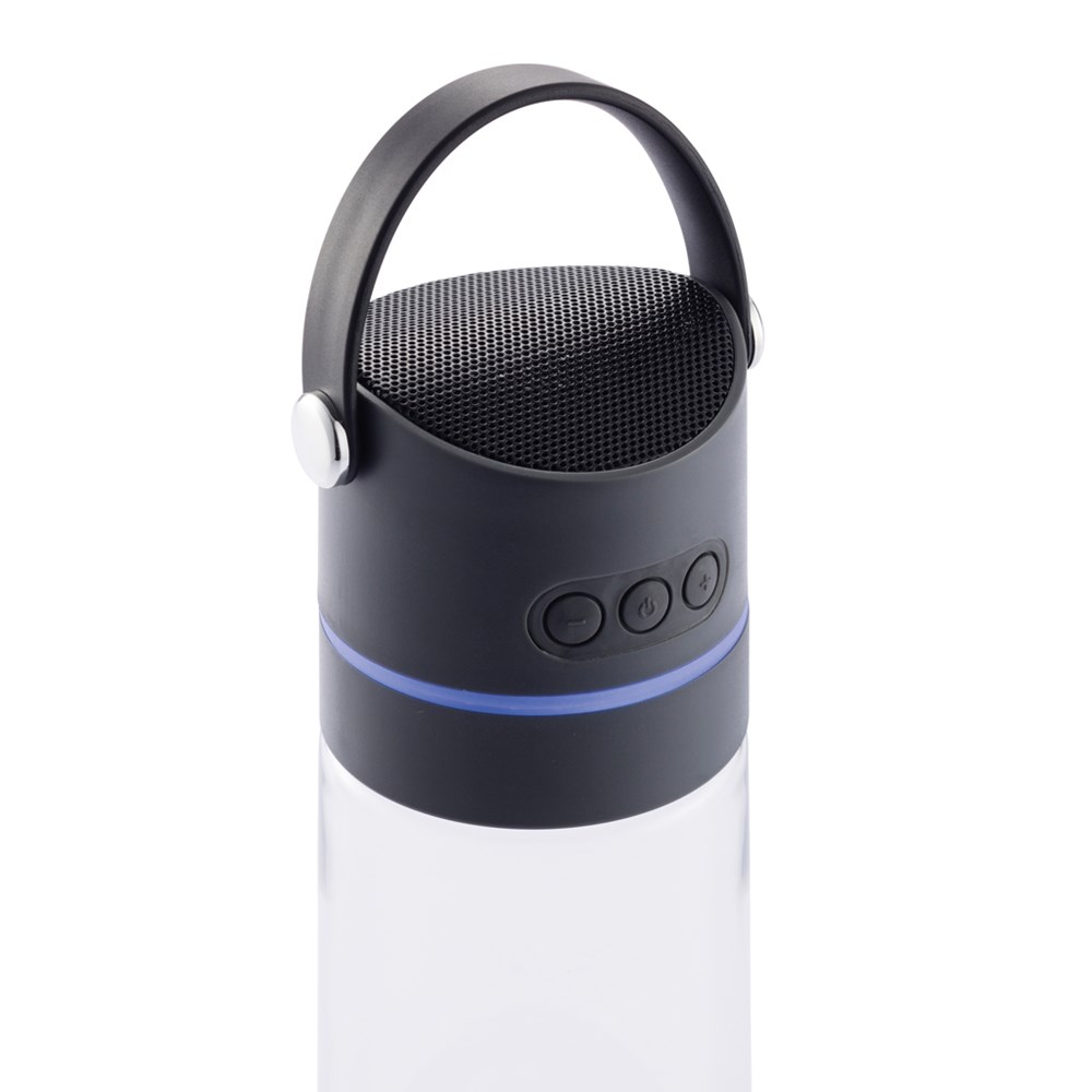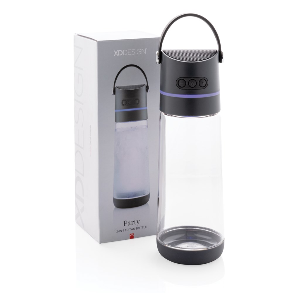 Langlebige Tritan Flasche mit kabellosem 3W Lautsprecher und Moodlight Die Batterie hat 450 mAh. Perfekt für draußen, unterwegs und zum Sport. Auslaufsicher und mit Trageriemen. 700ml Inhalt. Nur Handwäsche. Geschütztes Design®